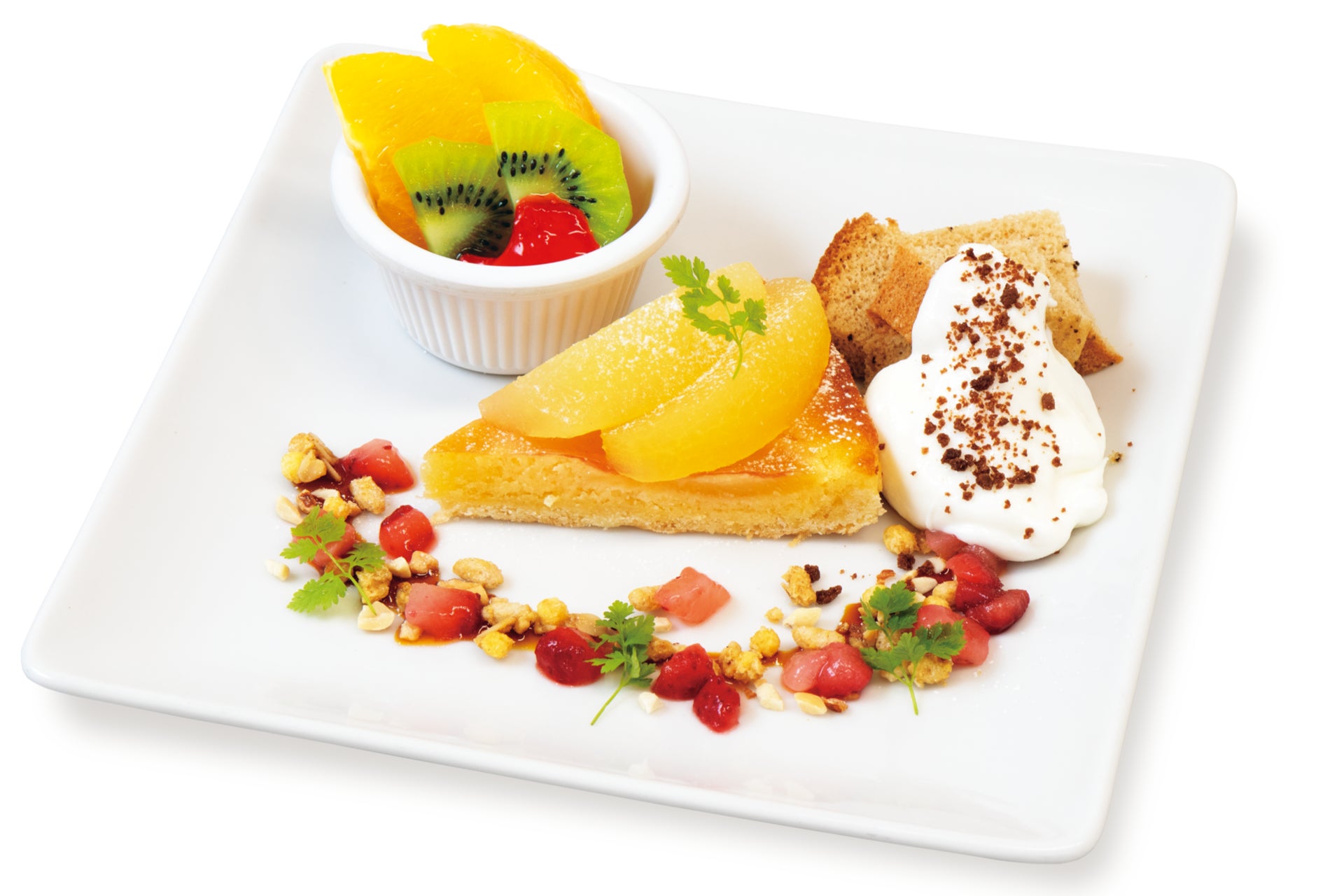りんごタルトと紅茶のシフォンケーキ、彩り鮮やかなフルーツを一皿で楽しめる盛り合わせプレート。