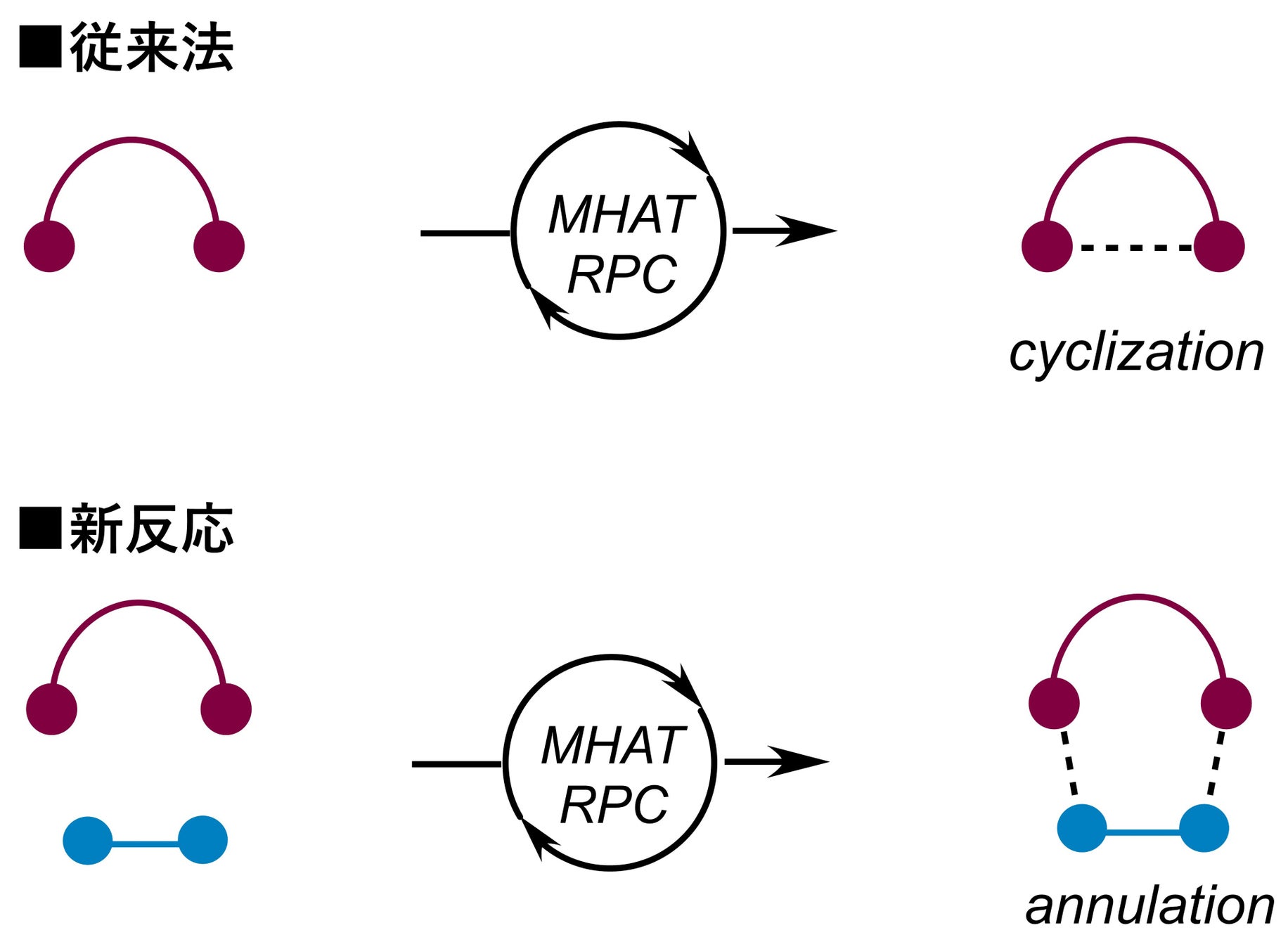 今回、本研究では医薬品などに含まれる複素環※2と呼ばれる骨格の合成を行いました。これまでのMHAT/RPC法による複素環構築では「1結合形成による環化(cyclization)」によって行われてきました(図1)。一方、今回の研究成果では「2結合形成による環化(annulation)」へ展開できることを見出し、複素環合成の適用範囲を大幅に拡大することに成功しました。この方法は高度な分子構造の構築に有効であり、医薬品の合成や機能性材料の創製において新たな可能性を提供します。