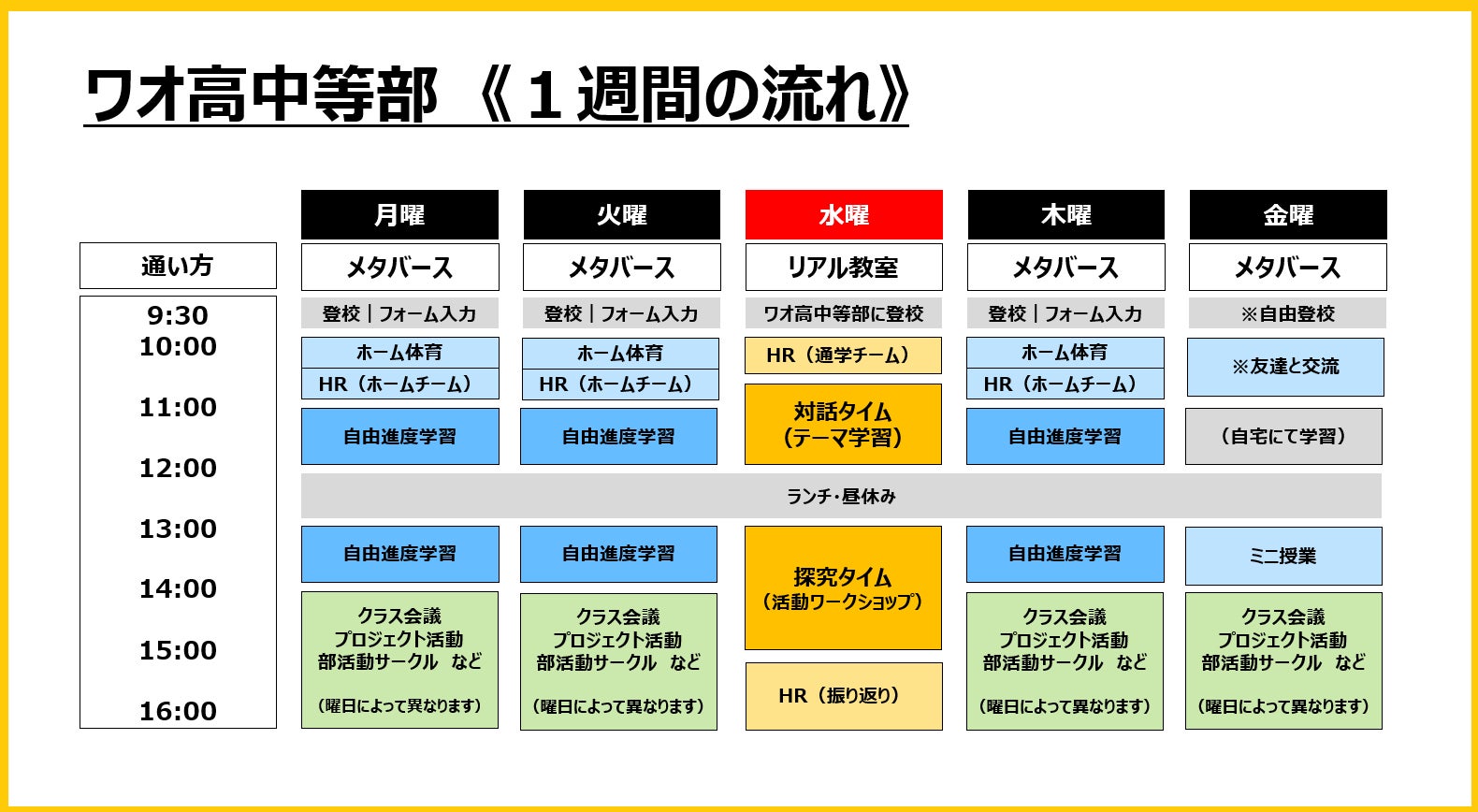 毎週水曜日、ワオ高校の先生や生徒たちと一緒に、学年の枠を超えた学びの場で、トコトン探究することで「好き」をドンドン増やしていき、新しい自分との出会いの場としてぜひご活用ください。生徒の受付は10月からスタートします。