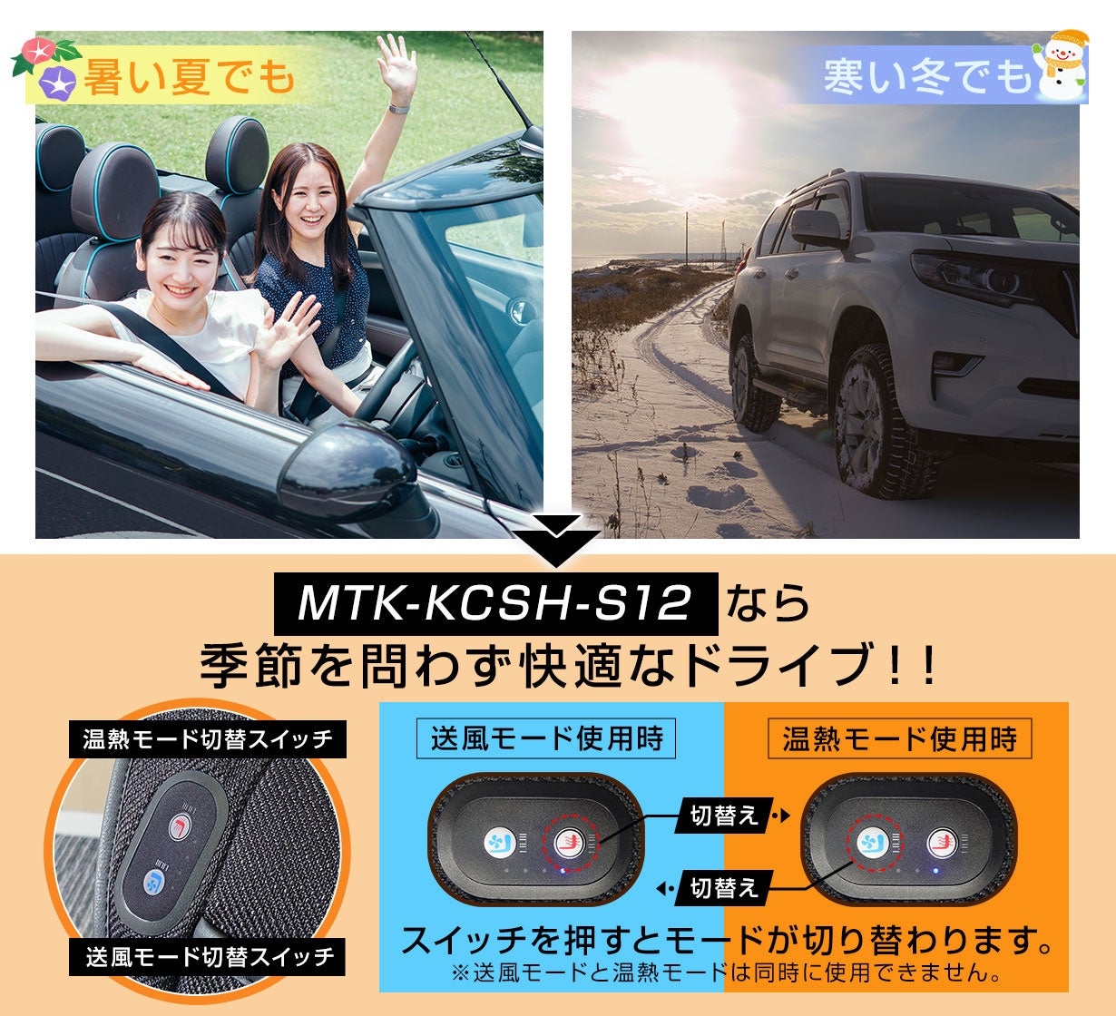 送風と温熱はワンタッチで簡単に切り替え可能(同時使用不可)。シートを季節ごとに交換する手間がなく、一年を通じて快適な車内環境を提供します。