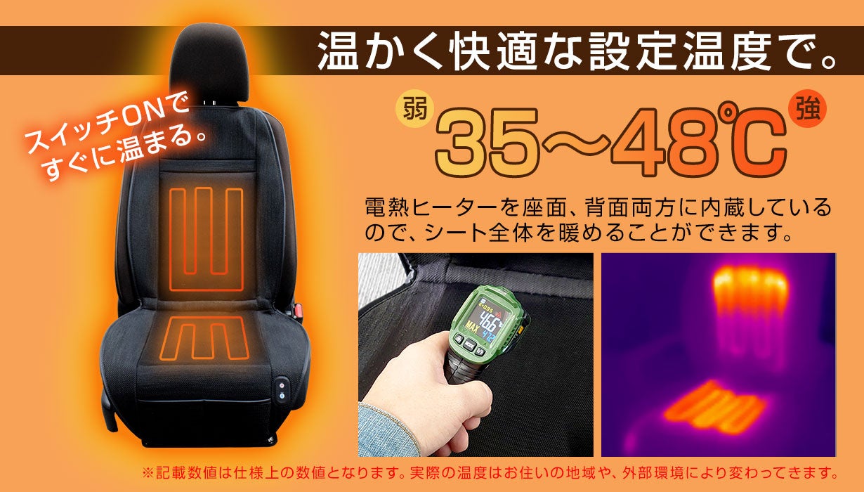 シート内部の背中と座面の両方に電熱ヒーターを内蔵しており、スイッチONで瞬時に温熱を開始します。暖房が効き始めるまでの冷え込む時間も、このシートがあれば「すぐポカポカ」の快適空間に。