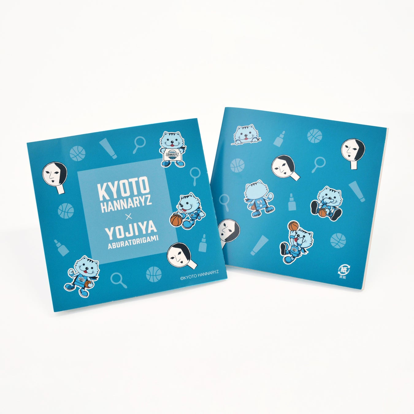 「よじこ」と京都ハンナーリズの公式マスコットキャラクター「はんニャリン」のコラボあぶらとり紙。ハンナリーズのオリジナルフォントの周りにはよーじやアイテムのシルエットとバスケットボールを散らしました。「はんニャリン」のお鼻にぴったりなサイズのあぶらとり紙です。