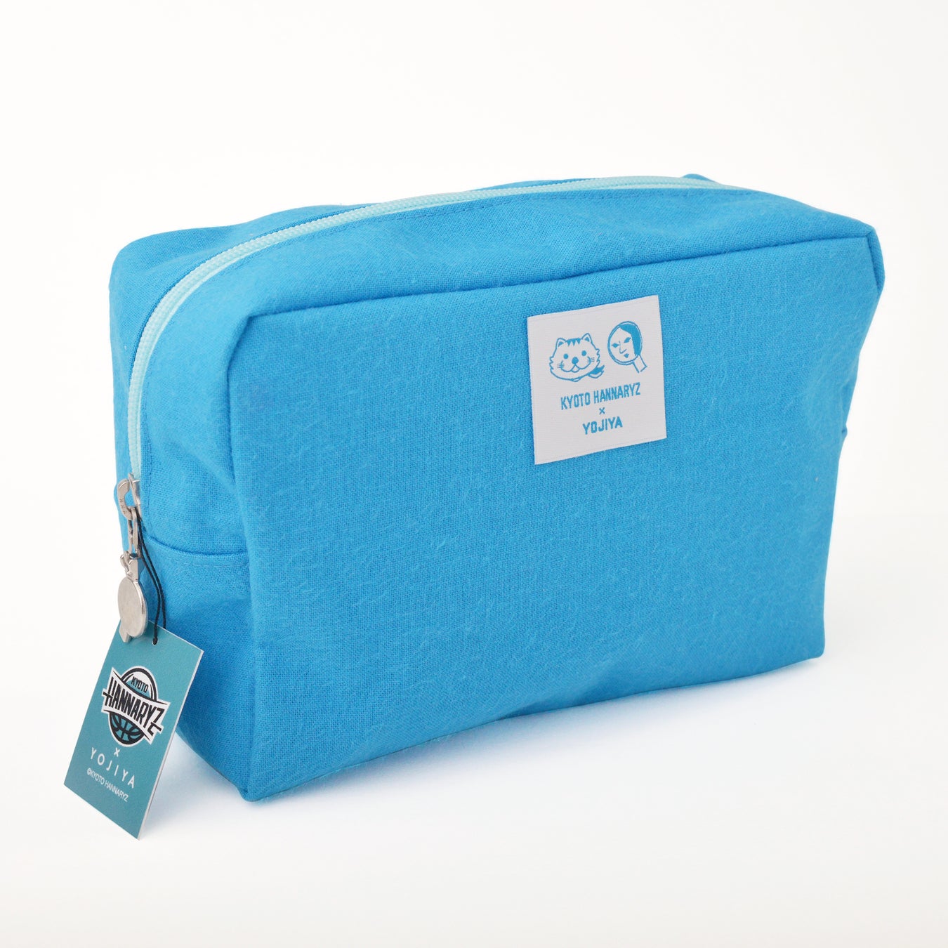 京都ハンナリーズのチームカラーである「ハンナリーズブルー」の生地に、クリア素材のサイドポケットが付いたポーチ。織ネームには「よじこ」と「はんニャリン」のコラボデザイン。応援グッズを入れて推し活にもどうぞ。