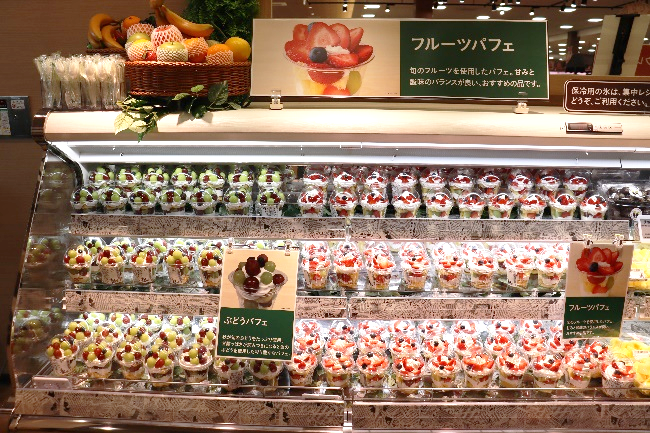 青果コーナーでは旬のフルーツを使ったパフェや大福などのスイーツやカットパイン、焼き芋など当社名物品の展開を強化。カットサラダやカット野菜の品揃えを充実させたり大型野菜のカット売りを強化したりするなど簡便ニーズに応えた商品展開を行っています。また、旬の果物の展開や陳列の表現を工夫し季節感の演出を図っています。