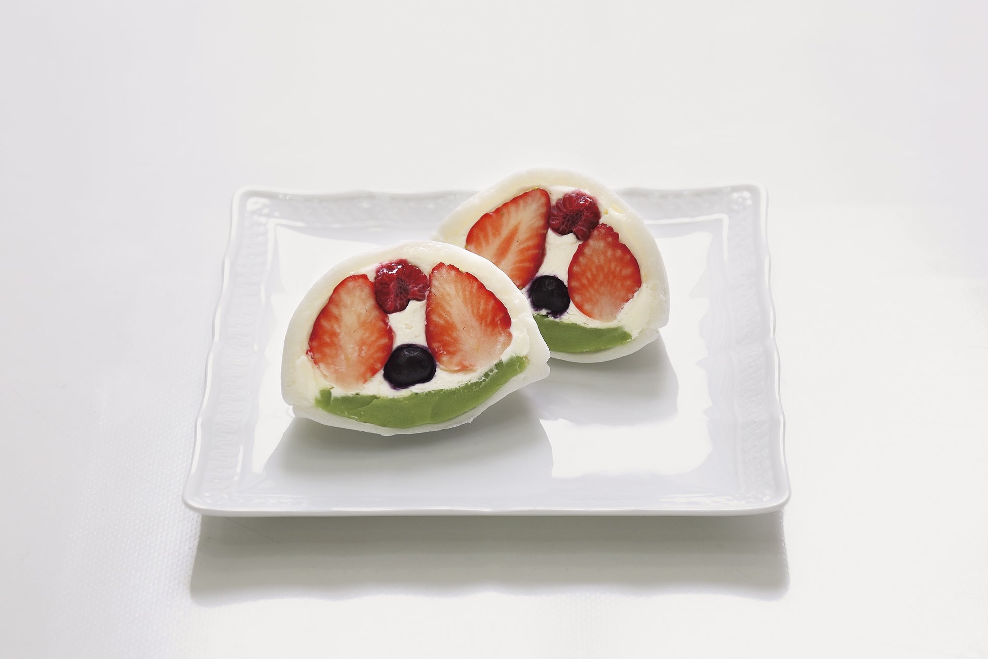 山形で創業130余年、5代にわたり続く「老舗 長榮堂」。山形産苺「おとめ心」が3粒も入り、つや姫の米粉を使ったお餅のふわふわ食感や、ホイップクリームと宇治抹茶餡が楽しめます。甘酸っぱいラズベリーとブルーベリーもアクセントになっています。
