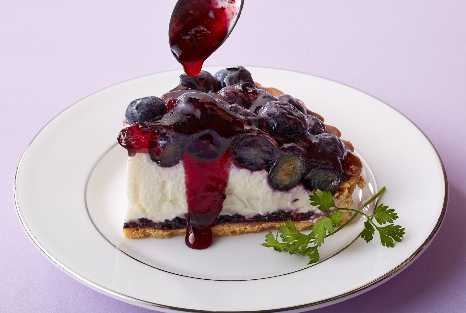 レアチーズケーキに尾花沢産の大粒ブルーベリーを贅沢にのせたタルト。さらに付属のブルーベリーソースをかけるとフルーティーさが倍増する、ラスクの名店が手がける一品です。