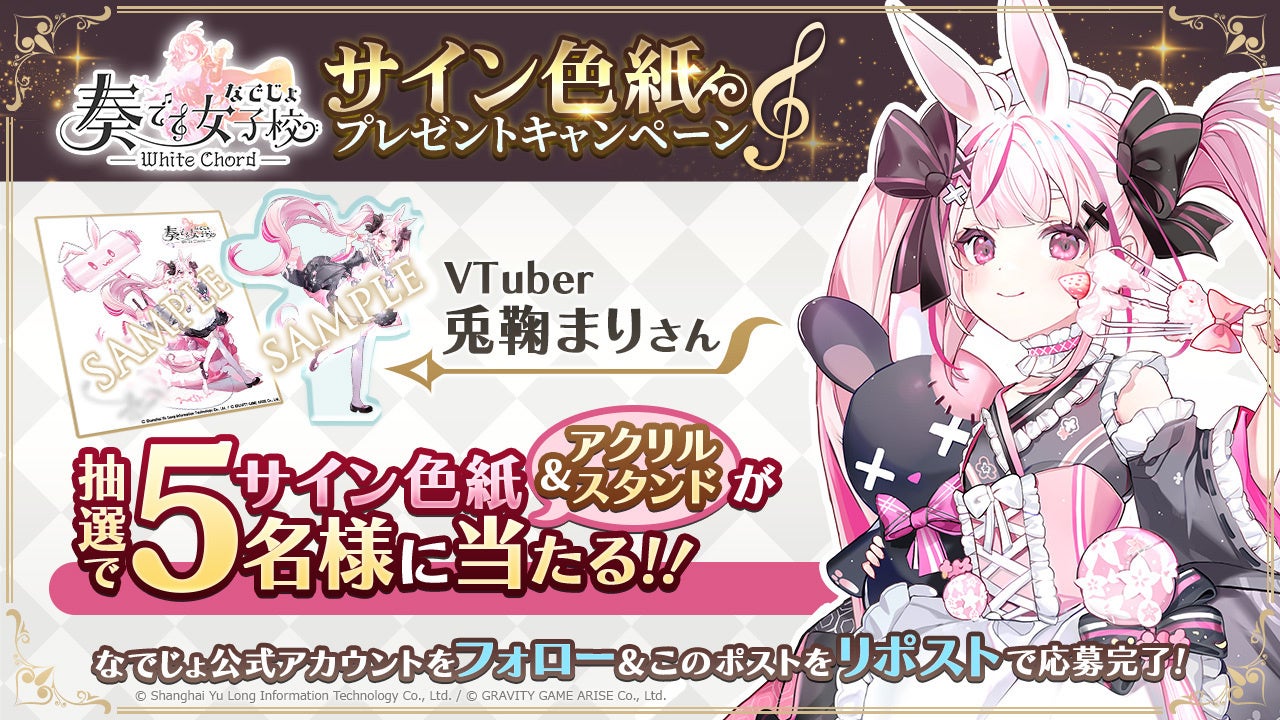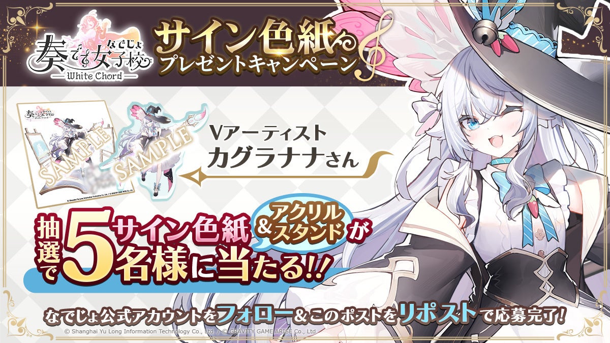 期間中に「兎鞠まり」か「カグラナナ」を手に入れて条件を満たして応募すると、応募者全員にもれなく、『奏でて女子校』の衣装を着たおふたりのアクリルスタンドをプレゼントいたします!