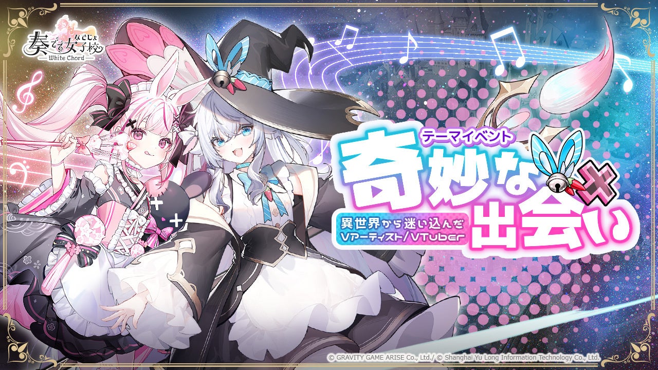 2023年8月29日(火)から10月20日(金) 4:59の間、VTuberの「兎鞠まり」さんとVアーティストの「カグラナナ」さんが登場するテーマイベント「奇妙な出会い」が開催!『奏でて女子校』の世界に迷い込んだおふたりと、『奏でて女子校』のキャラクターたちとの交流を描いた特別なストーリーを、ぜひお楽しみください。