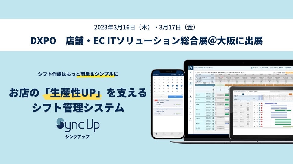 総合人材サービス、パーソルグループのパーソルイノベーション株式会社(本社:東京都港区、代表取締役社長:長井 利仁)が運営するSaaS型シフト管理サービス『Sync Up(シンクアップ)』は、2023年3月16日(木)・3月17日(金)にインテックス大阪で開催される関西最大級の店舗・EC ITソリューション総合展「店舗・EC DXPO」に出展することを決定しましたのでお知らせします。