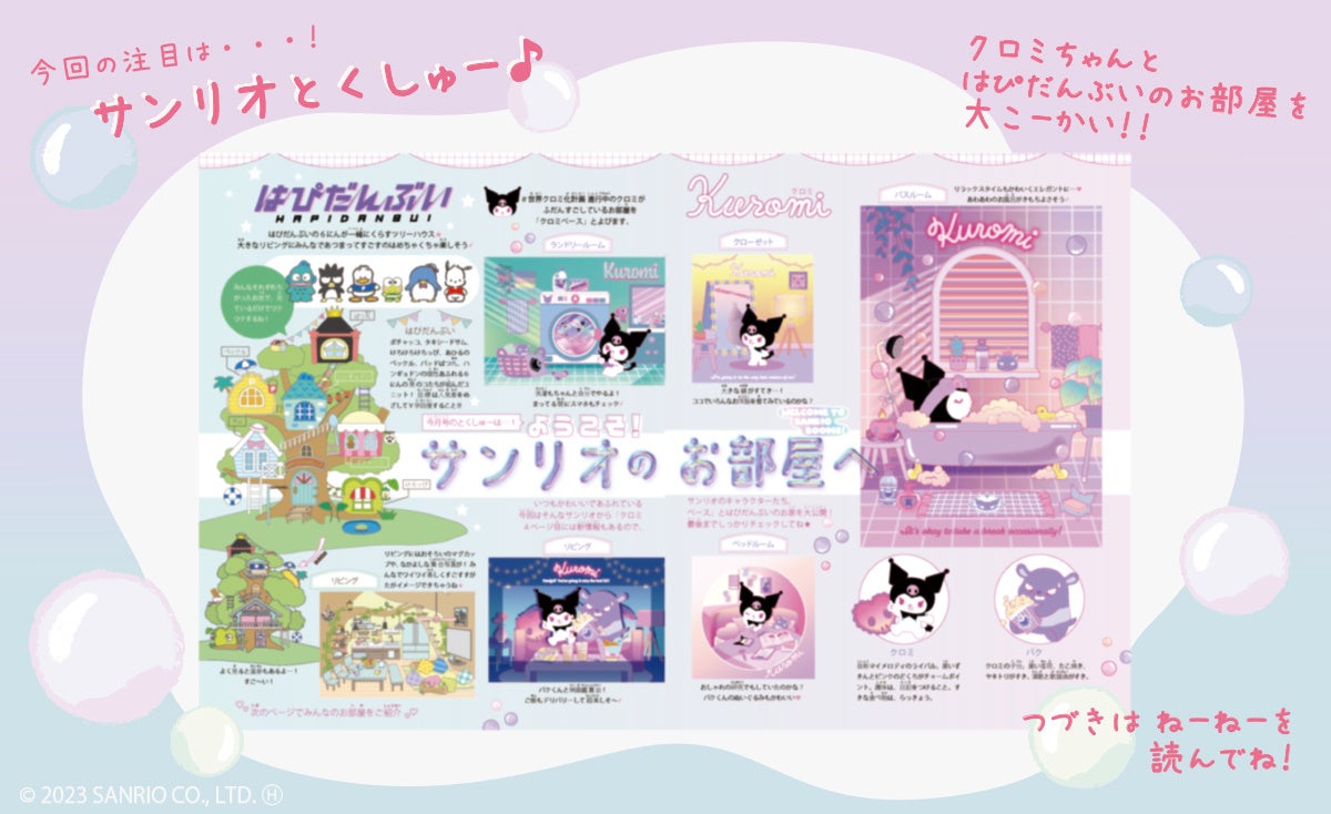 人気の「クロミ」と「はぴだんぶい」のふだんは絶対に見ることができない、おウチのすみずみまで大こーかいしています。好きなお菓子や家具、お友だちからの贈り物があって、見ているだけでワクワクしちゃうよ。