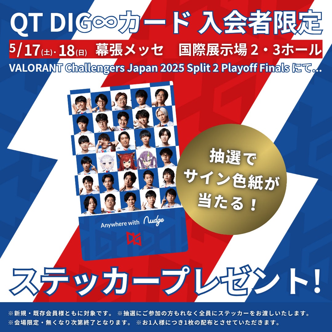 5月17日(土)・18日(日)に幕張メッセで開催される「VALORANT Challengers Japan 2025 Split 2 Playoff Finals」にて、QT DIG∞特設ブースが登場!この週末だけのスペシャルな企画として、新規で「QT DIG∞」クラブを選択してカードを発行された方だけに、ここでしか手に入らない限定ステッカーをプレゼントします!