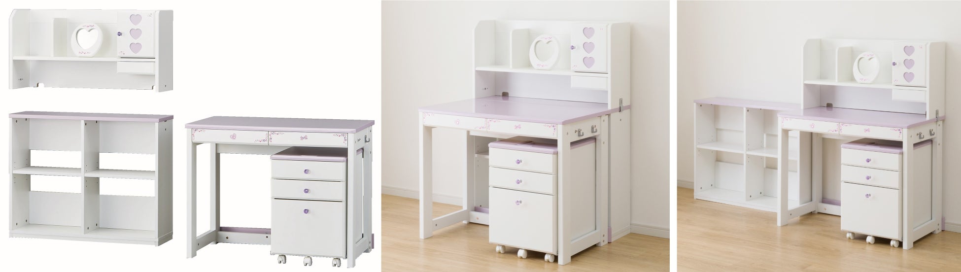 収納豊富な本棚が2分割出来るので、コンパクトな定番の学習机スタイルや、平机と本棚に分けて使用するなど、お部屋の広さやお子様の成長に合わせて自由にレイアウトできます。