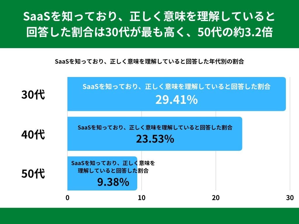 【SaaSを知っており、正しく意味を理解していると回答した割合は30代が最も高く、50代の約3.2倍】