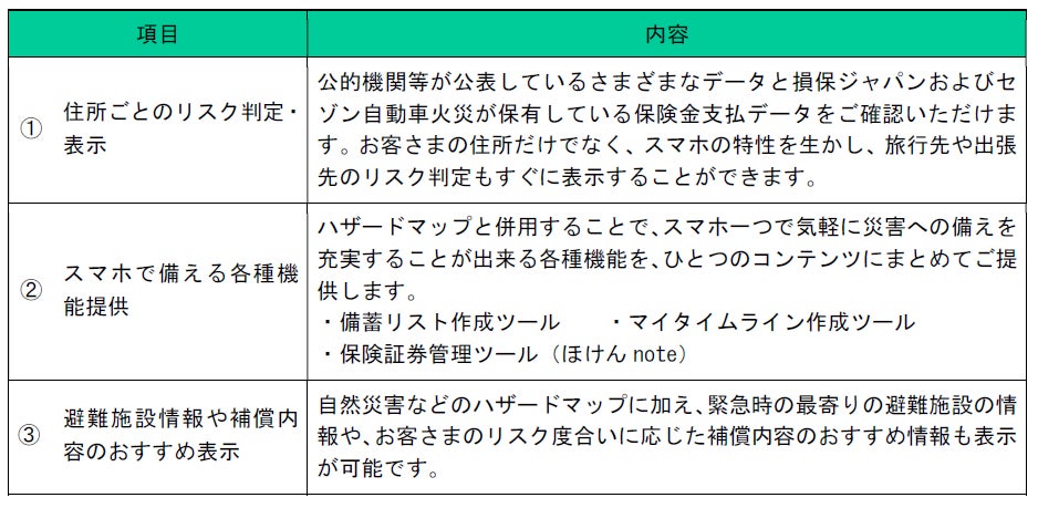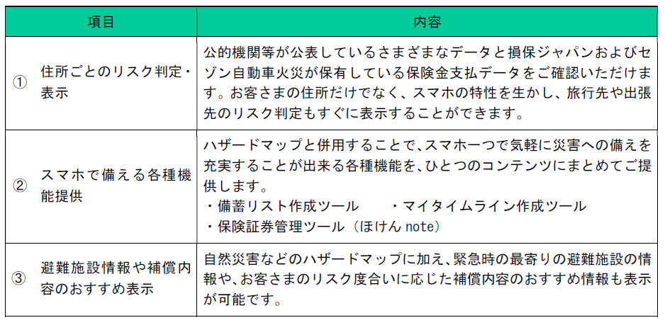 損害保険ジャパン株式会社(代表取締役社長:白川 儀一、以下「損保ジャパン」)とセゾン自動車火災保険株式会社(代表取締役社長:佐藤史朗、以下「セゾン自動車火災」)は、お客さまの『災害への備え』をサポートするために、SOMPOグループとして、ハザードマップの利活用推進を強化していきます。セゾン自動車火災では、スマートフォン(以下「スマホ」)で見られる個人向けハザードマップを12月21日から新たに提供します。また、損保ジャパンでは、従来から代理店経由でお客さまに提供している「THE すまいのハザードマップ」の情報を更新しました。なお、損害保険会社における代理店販売型・ダイレクト型、それぞれの特長を活かしたハザードマップの提供は国内初となります。