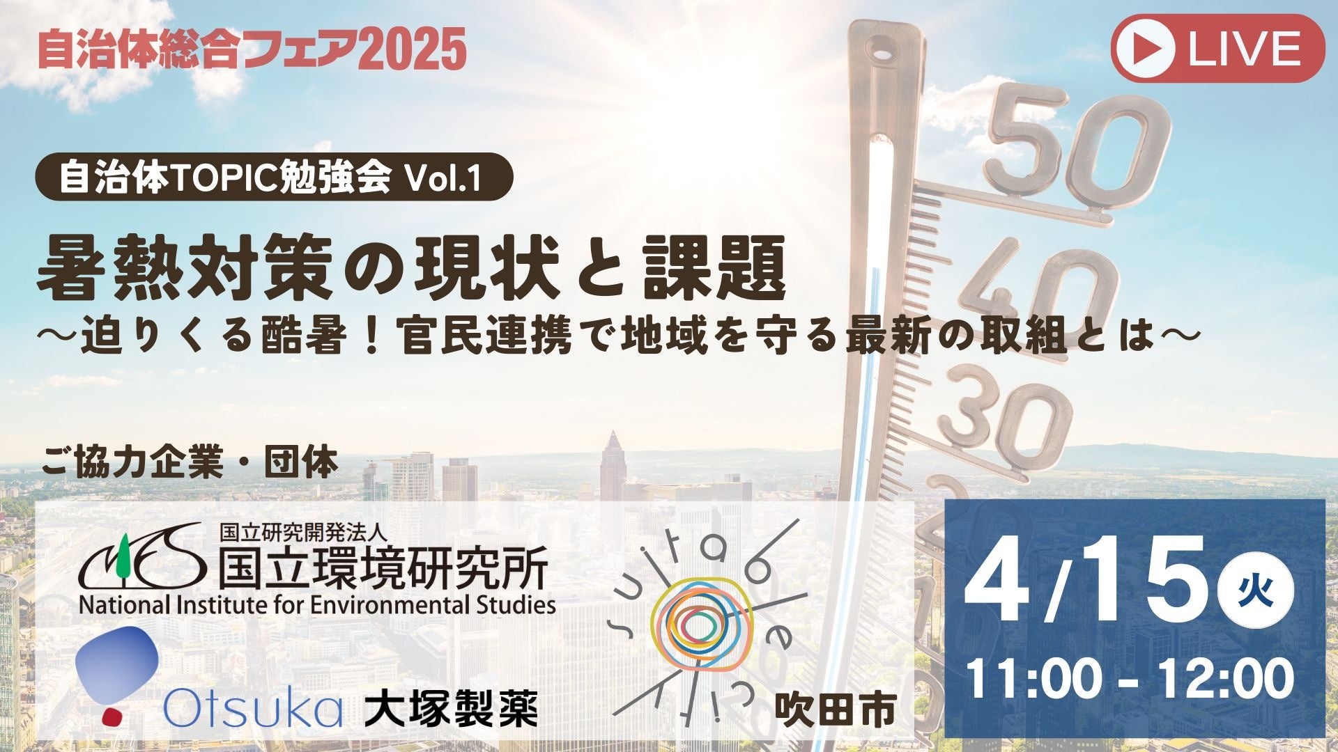 一般社団法人日本経営協会(本部事務局:東京都渋谷区、会長:高原 豪久)は、「自治体総合フェア2025」開催にさきがけ、無料オンラインセミナー「暑熱対策の現状と課題〜迫りくる酷暑!官民連携で地域を守る最新の取組とは〜」を4月15日(火)11~12時に開催いたします。