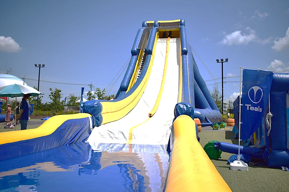 ビル4階に相当する高さ約12m、長さ36mの巨大ウォータースライダー「タイタン」のほか、4歳から楽しめる「シーアニマルスライダー」や約80m²の「じゃぶじゃぶ池」、「噴水エリア」など水遊びできるエア遊具が登場します。
