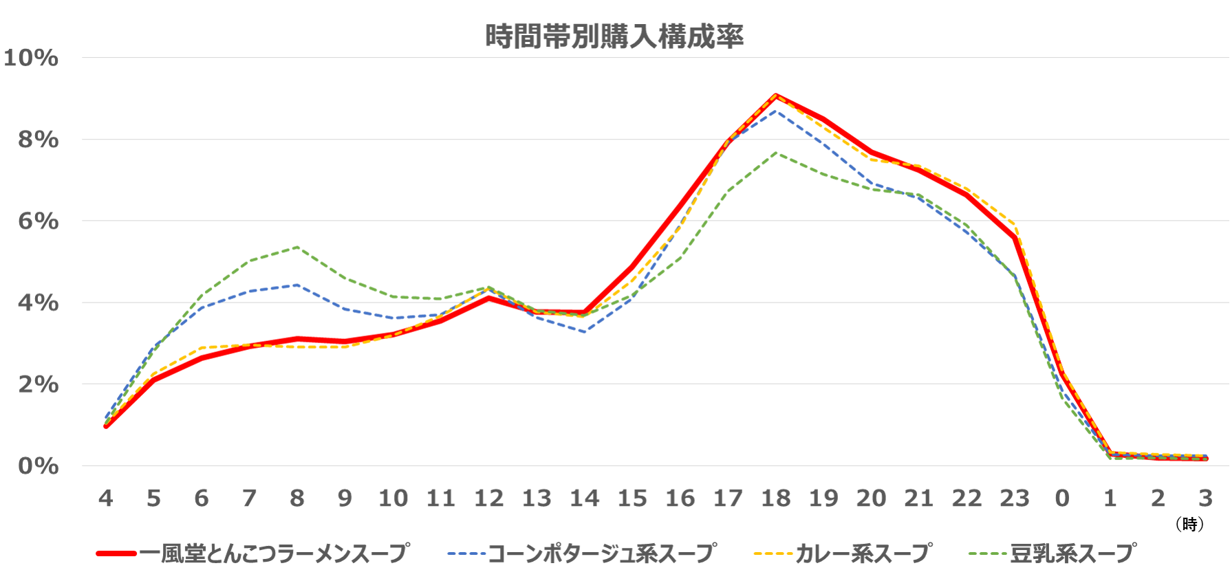 当初、「コクと旨味の一風堂とんこつラーメンスープ」は、夕方から夜の遅い時間にかけての「夜軽食ニーズ」を見込んでいました。実際に、POSデータでどの時間帯で購入されているかを見てみると、14時から上昇傾向が始まり18時がピーク、21時まではスープカテゴリー内ではほぼTOPの実績でした。