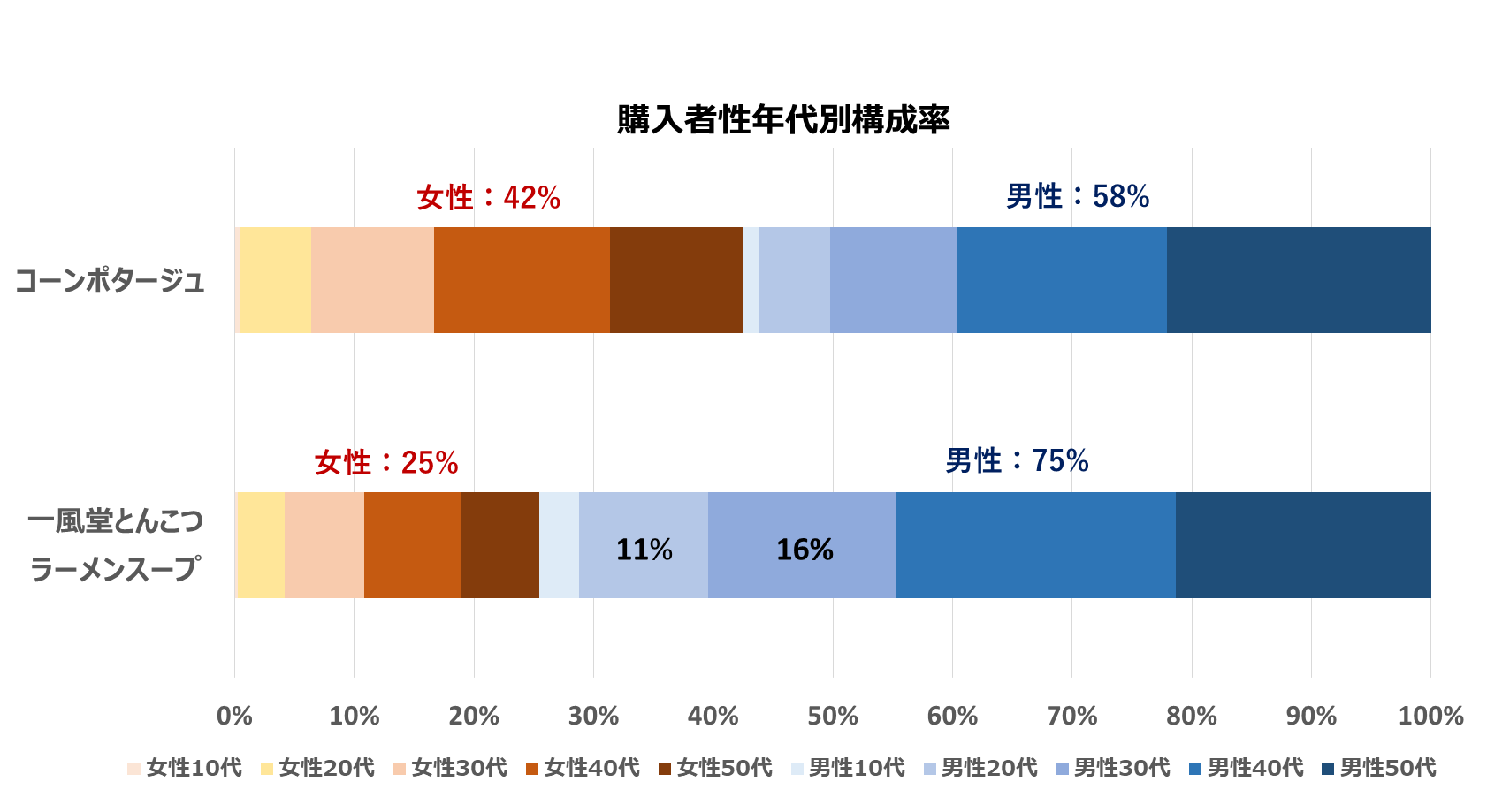 アキュアの自販機のPOSデータを分析すると、「コクと旨味の一風堂とんこつラーメンスープ」は男性の購入比率が約75%となっています。特に他の缶スープ商品と比べると20~30代の購入が多いのが特徴です。