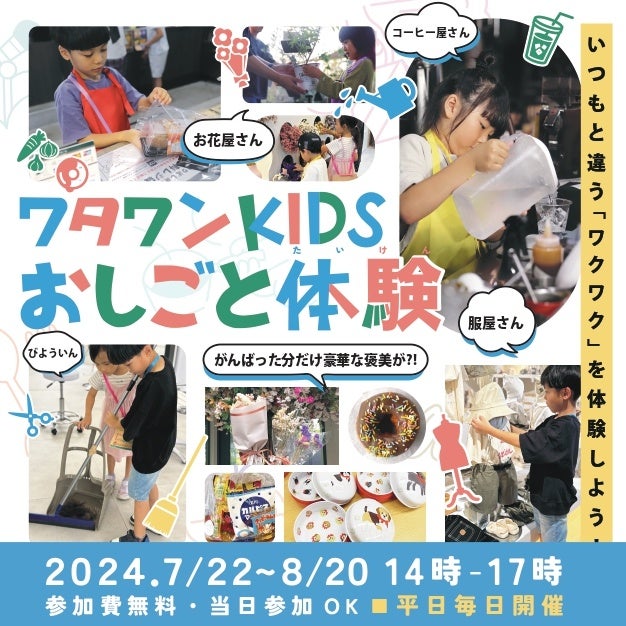 株式会社antiqua(本社:大阪府和泉市)はこの度、南大阪の滞在型エンターテインメントモールWHATAWON(所在地:大阪府岸和田市 以下:ワタワン)で4歳以上のお子さまへ向けたイベント【ワタワンKIDSお仕事体験】を2024年7月22日(月)~2024年8月20日(火)まで期間中の平日に毎日開催いたします。参加費は無料。楽しく学びながらワタワンでしかできないお仕事を体験して、ご褒美をもらおう!