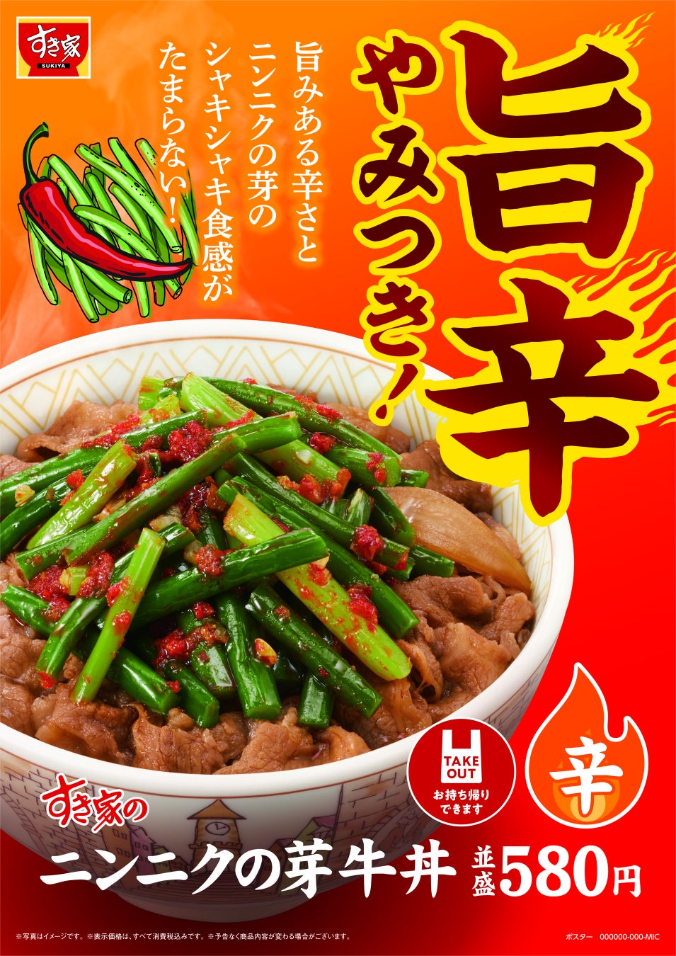 【すき家】ニンニクたっぷり旨辛だれとシャキシャキ食感がたまらない!夏の大人気商品「ニンニクの芽牛丼」が登場!
