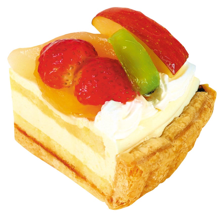 軽いタイプのカスタードクリームとスポンジを重ね、上面に苺を中心にりんご、キウイ、白桃・黄桃のシロップ漬けを彩り豊かに飾った贅沢感のあるパイです。パイ生地にしのばせた甘酸っぱい杏ジャムがフルーツの甘さを引き立てます。
