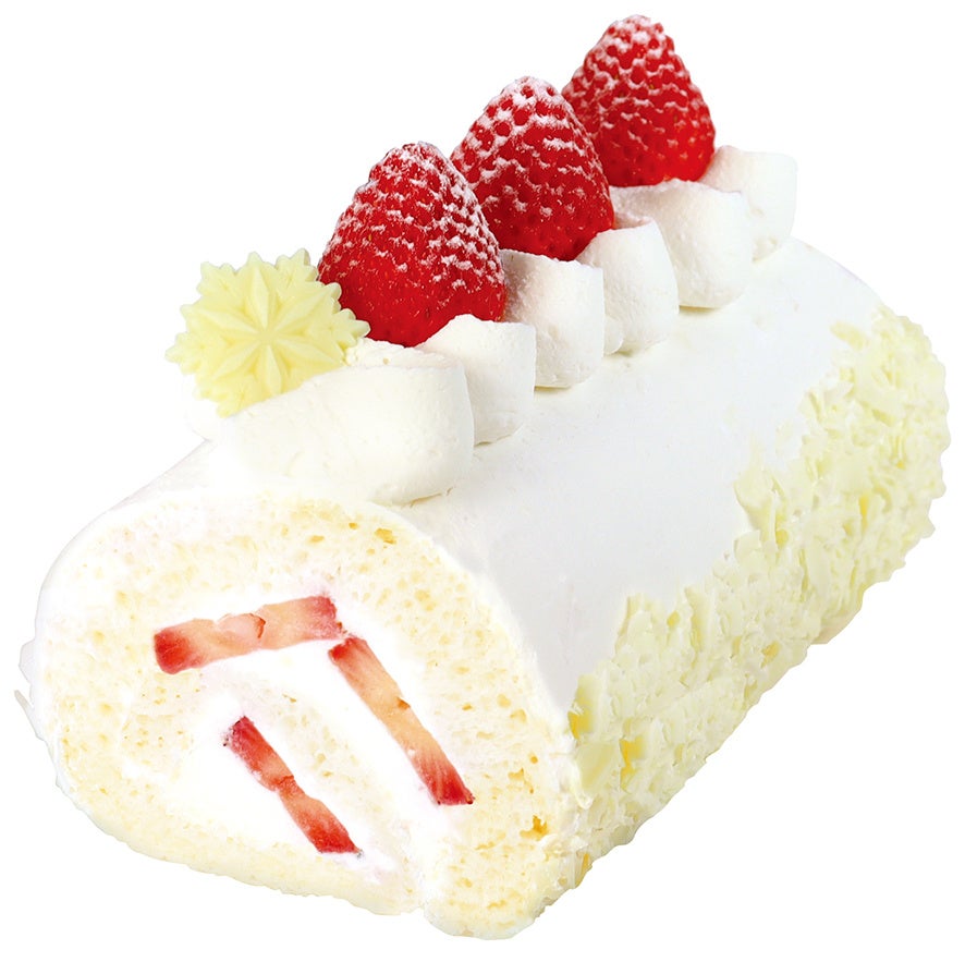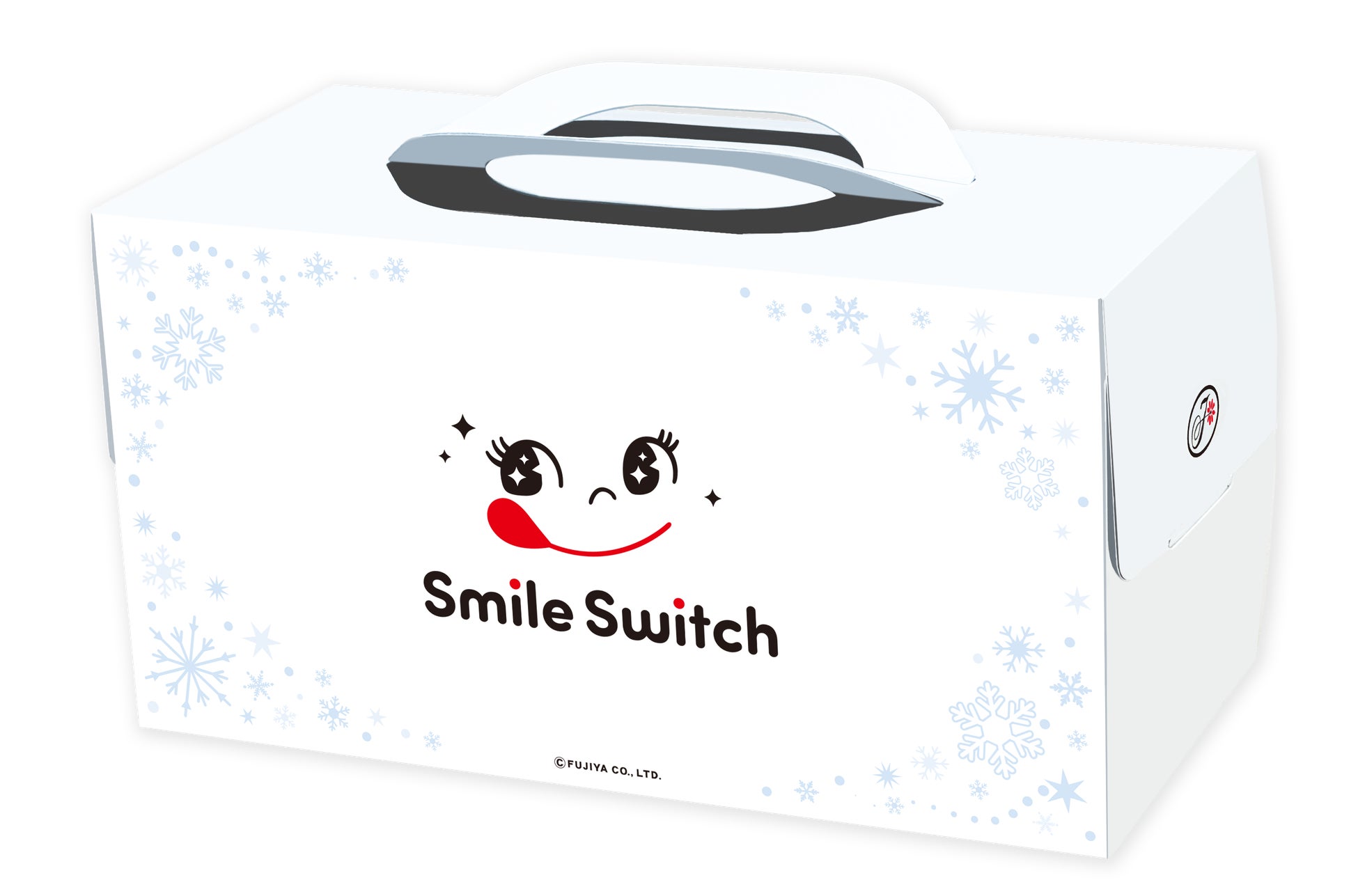 白いスポンジで、練乳入りシャンテリークリームとスライス苺を巻いた純白のミルキーロールです。上面には雪の結晶のチョコアタッチメントと国産苺3粒を飾り、サイドはホワイトチョコフレークで仕上げました。「Smile Switch」のロゴマークが可愛い専用BOX付きで、手土産にもぴったりです。