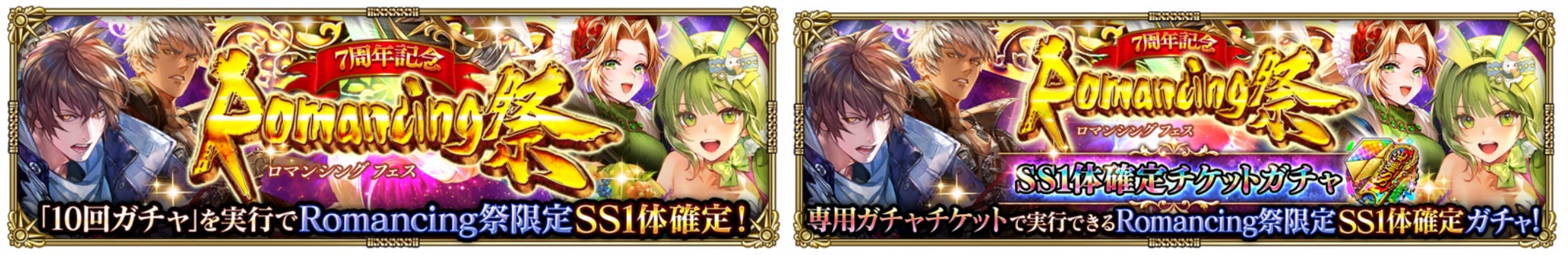 本ガチャでは、通常ガチャと「7周年記念 SS1体確定Romancing祭チケット[期間限定]」で実行できるガチャの2種類をご用意しております。
