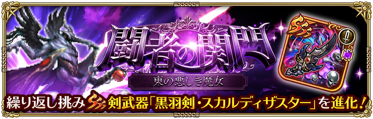 「闘者の関門-東の悪しき魔女- 特別クエストチケット[期間限定]」を使用することで、特別クエストに挑戦でき、専用進化素材「黒羽剣・スカルディザスター進化煌星」を追加で1,000個獲得できます。