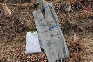 植樹後はシカの食害や強風の対策としてネットで苗を覆っています。