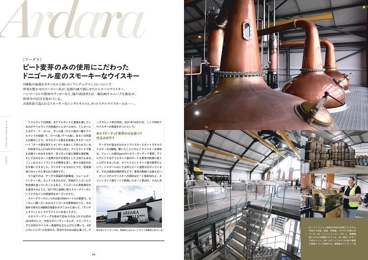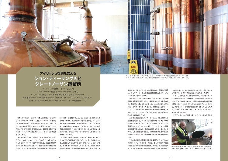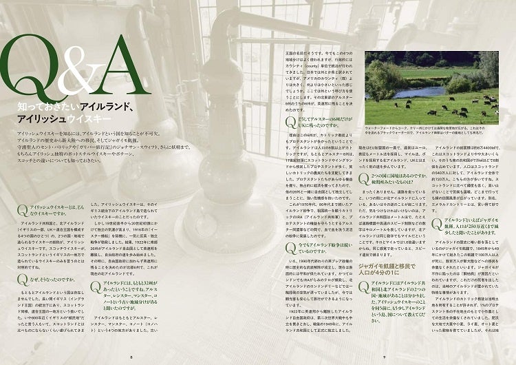 巻頭ではアイリッシュウイスキーの基本的な定義や製法、スコッチとの違い、さらに北アイルランドとアイルランド共和国の歴史や文化をQ&A方式でわかりやすく解説した「知っておきたいアイルランド、アイリッシュウイスキー」を掲載。さらに巻末にはアイリッシュ特有のポチーン、そしてアイリッシュ復興の立役者でもあるジョン・ティーリング氏をフィーチャーした読み物のほか、多彩なエピソードを交えたコラムなども収録。アイリッシュウイスキーを理解するために必須となる情報が満載です。