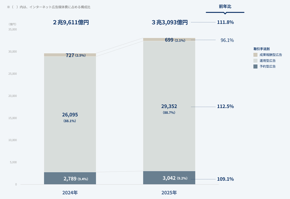 2025年のインターネット広告媒体費は、前年比111.8%の3兆3,093億円(電通「2025年 日本の広告費」より)であった。インターネット広告媒体費を広告種別で見ると、ビデオ(動画)広告は前年比121.8%の1兆275億円となり、推定開始以降初めて1兆円を突破した。その構成比は30%を超え、引き続き高い成長率を維持している。一方で、ディスプレイ広告は過去数年横ばい傾向であった運用型を中心に回復し、上昇傾向に転じた。【グラフ1】