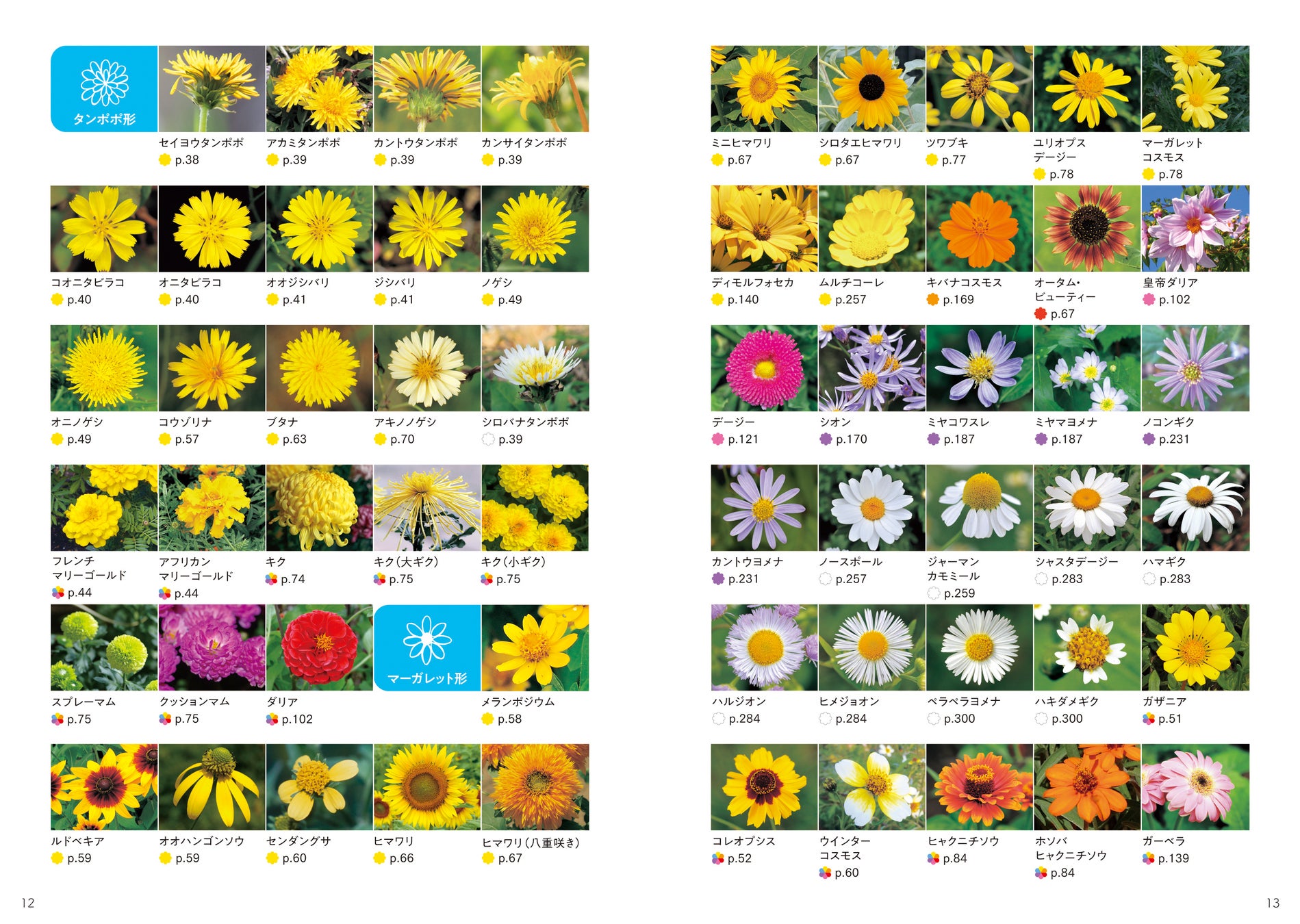 巻頭には花の形ごとに分類した写真つきのインデックスを収録。チューリップやパンジーなど花色が複数ある園芸種など、色での検索に迷う場合は、花の形から探すこともできます。