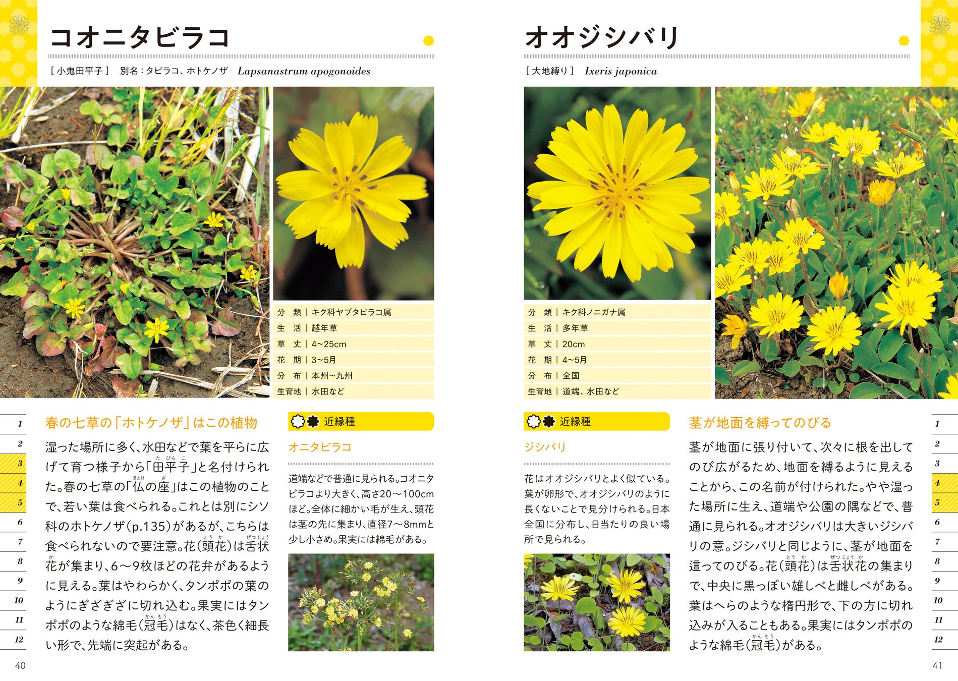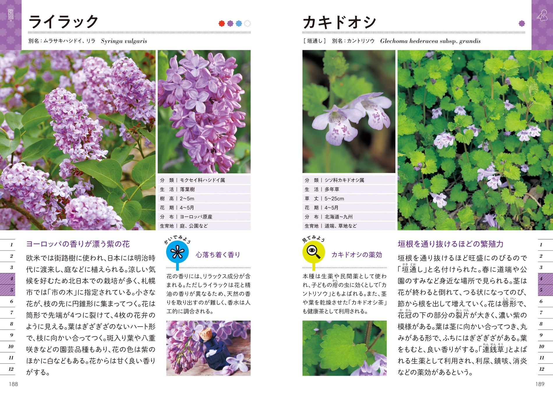 各花の解説ページでは、近縁種、関連種、つながっている生き物の紹介のほか、「見る・聴く・かぐ・触る・味わう」の五感を使った観察の楽しみ方を紹介しています。