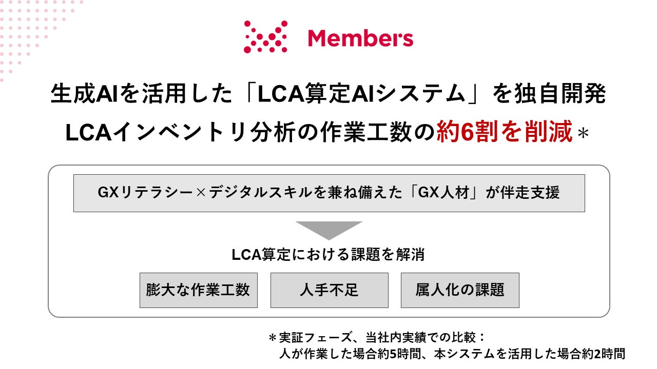 デジタルビジネス運用支援で企業の脱炭素DXを推進する株式会社メンバーズ(本社:東京都中央区、代表取締役社長:髙野 明彦、東証プライム:2130、以下「メンバーズ」)は、生成AIを活用した「LCA算定AIシステム」を独自開発し、本システムの導入から運用・定着までをGX人材が伴走支援することによる、企業のLCA算定の効率化および内製化支援を開始します(※1)。これにより、企業のLCA算定における膨大な作業工数、人手不足、属人化などの課題を解消します。
