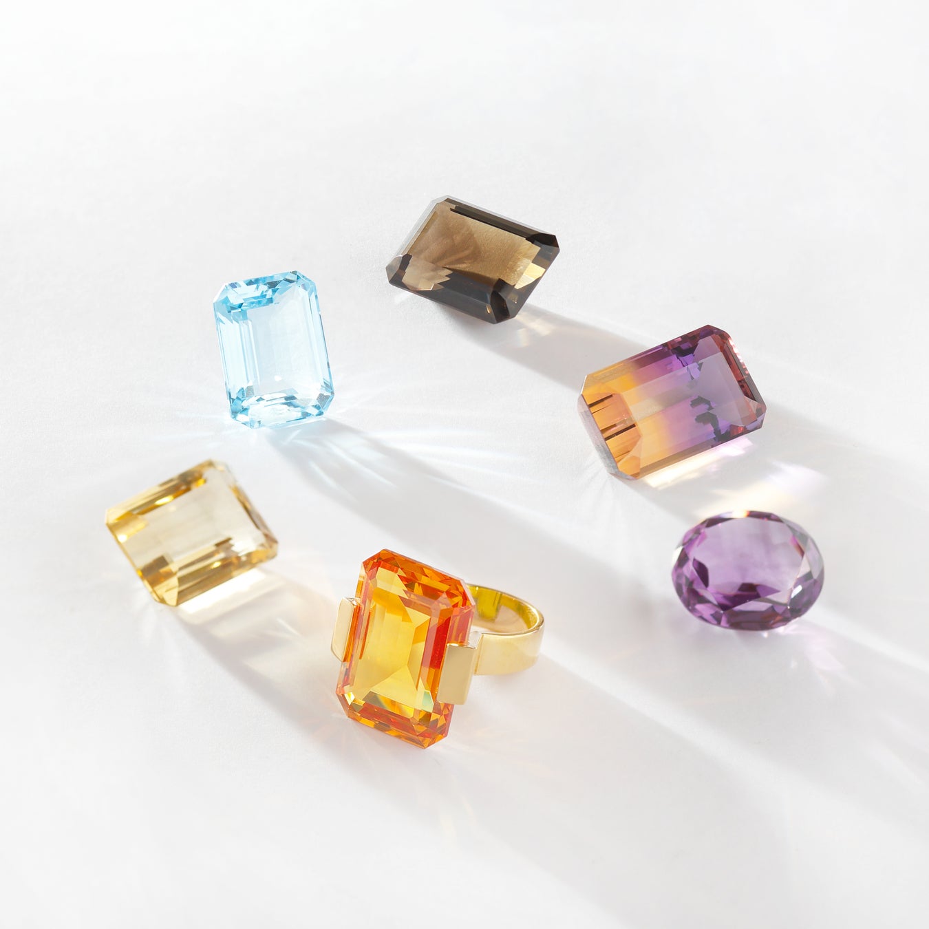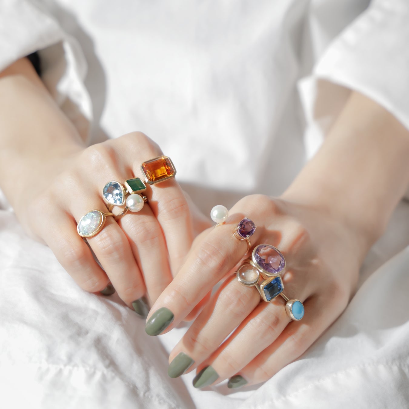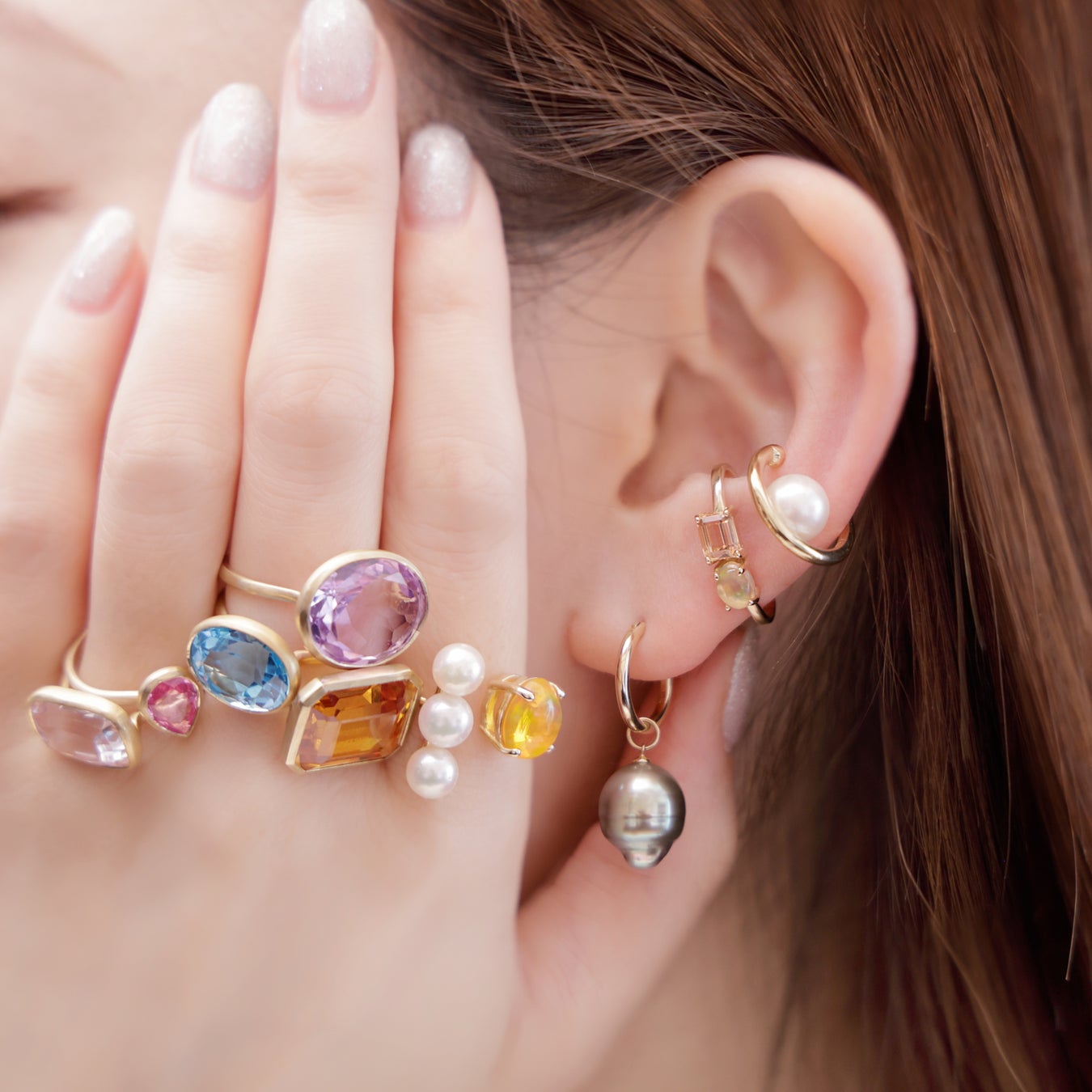 今回のPOP UP STOREではmi luna史上最も大きい1.5×2.5cmのアメジスト、アメトリン、レモンクォーツなどの天然石超特大ルースが初登場、自分だけのカスタムジュエリーとしてデザインや素材を組み合わせてオーダーできます。カスタムオーダー以外に、お客様から長く支持されているデザインを集めた定番コレクションも用意し、エメラルドなどの貴石からアメジスト、ブルートパーズなど半貴石など50種類以上から、お好みのサイズやカラーが選べます。大きさや石の種類、地金の素材などに幅があるため、用途や予算にあわせて自分だけのジュエリーに出会えるチャンスです。さまざまな表情に輝き、光によって濃淡を見せる天然石は、実物を見てじっくりと選びたいもの。この機会にぜひご来店ください。