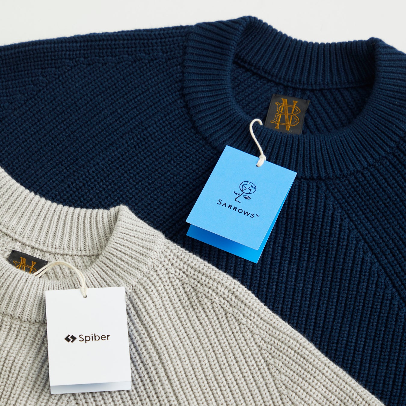 今回、「ユナイテッドアローズ」は、ナチュラル、ネイビーの2色の糸をスパイバーとの協業で開発。「バトナ―」がその糸を使用して(*)、代表モデル「シグネチャー」のクルーネックニットに編立てました。素材の良さとそれを一層引き立てる畔(あぜ)編みの高精度な技術により、豊かな表情と上質な着心地を併せ持つニットが完成しました。最先端のテクノロジーから生み出されたサステナブル素材と老舗ニットメーカーによる伝統技術を掛け合わせた逸品です。