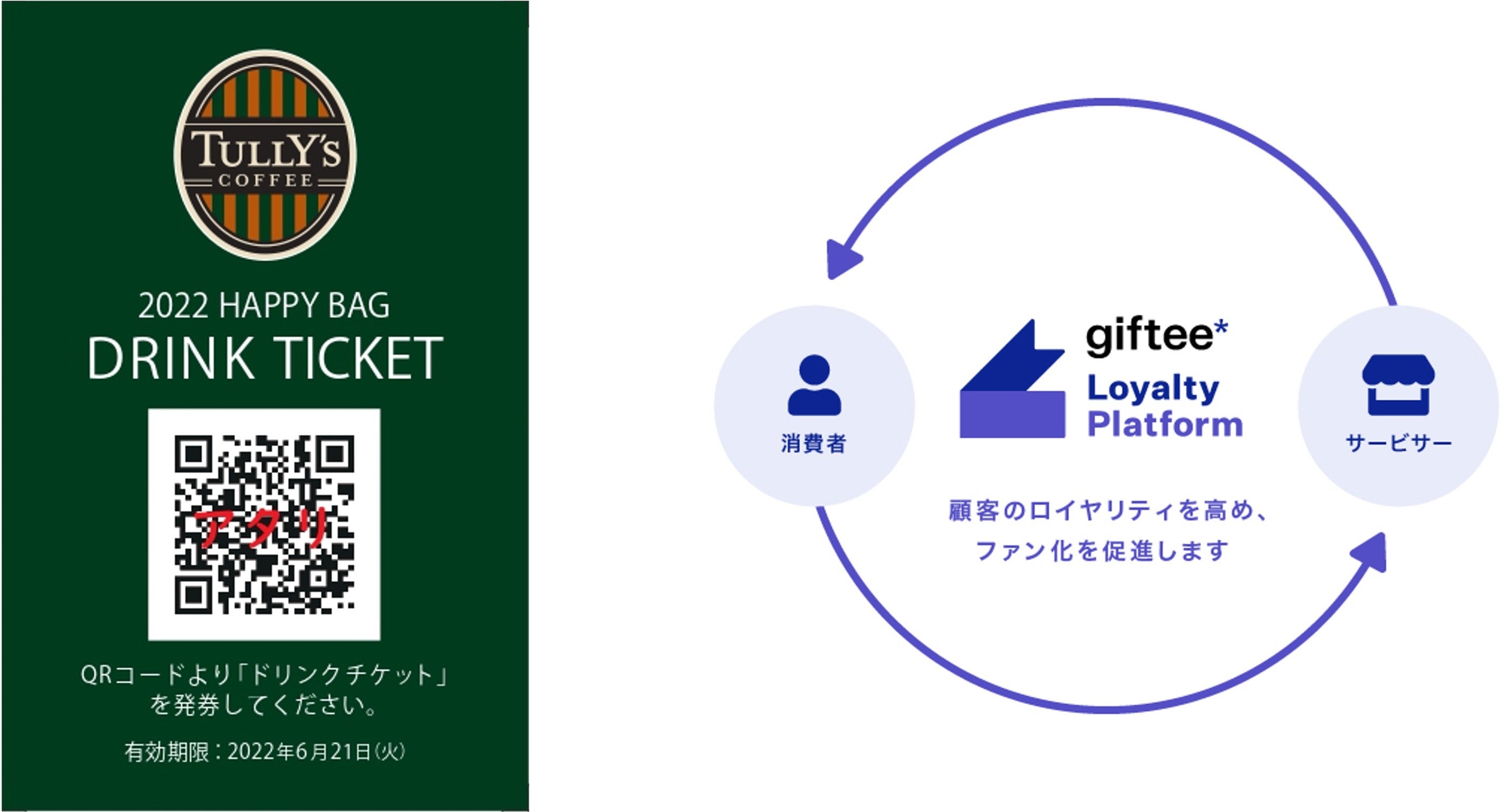 この度、「giftee Loyalty Platform」を導入いただきましたタリーズコーヒーは、1992年にシアトルで生まれたスペシャルティコーヒーショップです。日本では1997年に第1号店が銀座にオープンし、現在、全国に760店舗(2021年12月時点)を展開しています。「地域社会に根ざしたコミュニティーカフェ」を理念に、一杯一杯手作りの本格的なコーヒーと寛ぎの空間を提供しています。2020年8月にはeギフト販売システム「eGift System」(※2)を採用いただき、タリーズコーヒー全店でご利用いただけるeギフトを販売いただいておりました。この度、タリーズコーヒーが定期的に販売されている福袋「HAPPY BAG」などに封入される紙の回数券「ドリンクチケット」の利用実績のデータ化を目的としたデジタル化を促進する中で、既存の運用基盤やツールをマルチユースでき、店舗オペレーションの新規構築が不要な点から、2021年5月、7月、12月の計3回、「giftee Loyalty Platform」および「インスタント回数券機能」を採用いただいております。