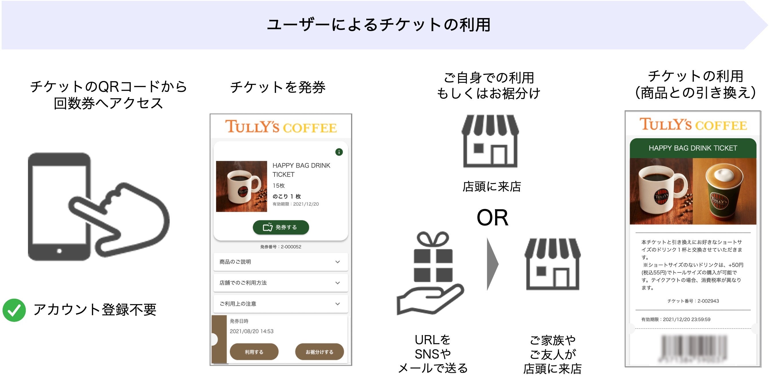 タリーズコーヒーの福袋「HAPPY BAG」などに封入されたインスタント回数券「ドリンクチケット」(完売のため、現在は販売を終了しております)は全国756店(2021年12月時点)のタリーズコーヒー店舗で、店内飲食517円(税込)、お持ち帰り507円(税込)までのドリンク1杯と交換いただけます。店舗で「ドリンクチケット」を利用する際は、チケットに印刷されたQRコードを自身のスマートフォンで事前に読み取ってチケット券面を表示し、来店時にスタッフがスマートフォンの画面に表示されたバーコードをPOSで読み込むことで決済が完了します。また、本回数券には、「おすそわけ機能」もあわせて導入いただいており、回数券をご購入された方は、SNSやメールなどに”おすそわけ”する回数券のURLをコピーして送信することで、家族や友人に回数券を1枚単位でプレゼントすることができます。