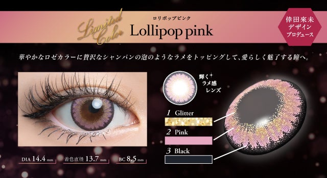 今回発売するのは、今年2月に発売し話題を集めたグリッターレンズ(バブルギャラクシー・ルモアヴィーナス)に続く3作目、倖田來未デザインプロデュースレンズLollipop pink(ロリポップピンク)。
