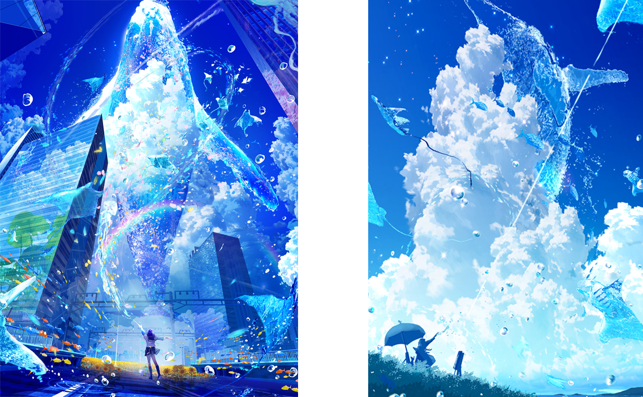 イラストレーター・風景画家。青空、星空、夜空、夕焼け空、花火など、空をテーマにしており、透明感のある海洋生物が空を自由に回遊する幻想的なイラストの数々はTwitterやInstagramなどで発表されるたびに話題となっています。