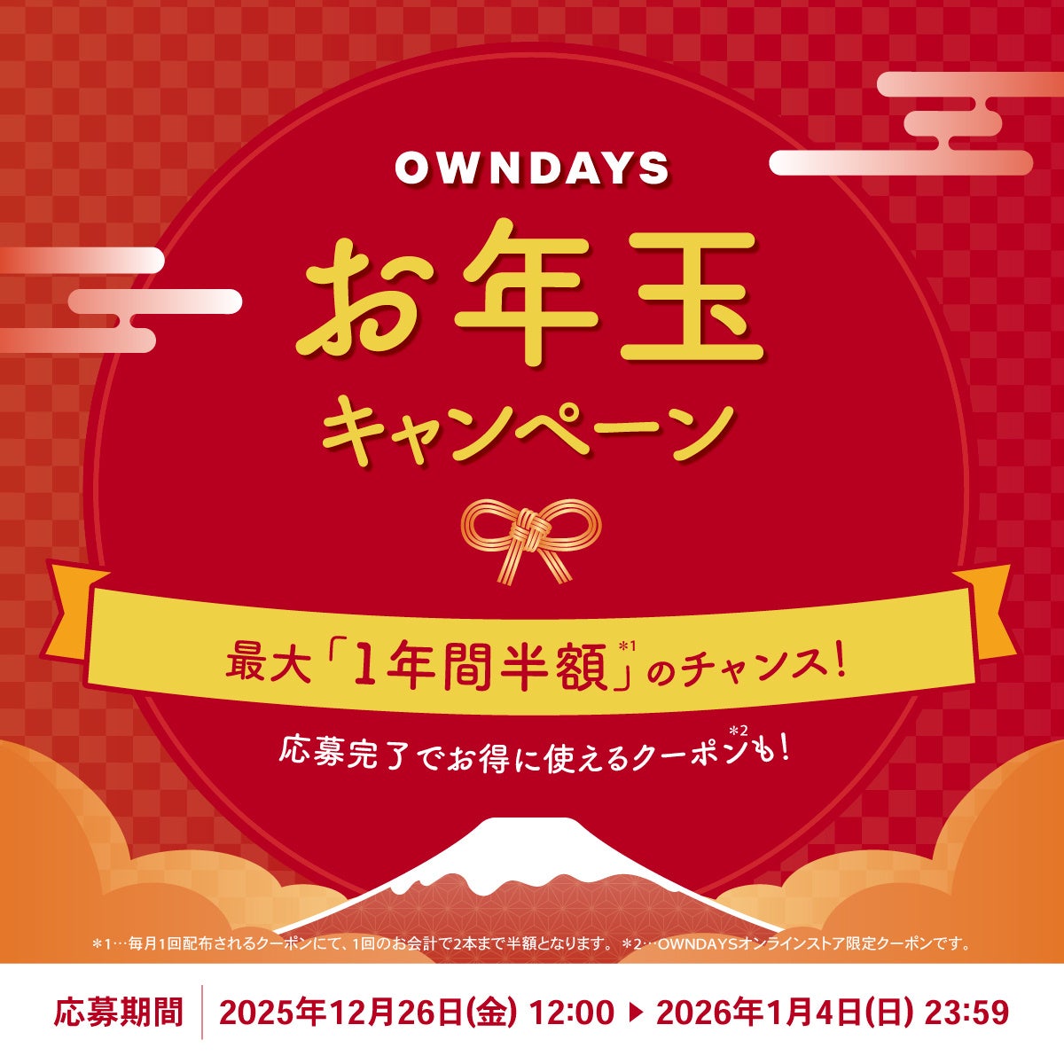 【OWNDAYS|オンデーズ】2026年を最高の視界ではじめる豪華ダブル企画始動!「冬の大感謝祭」で人気のフレームが最大50%OFF!さらに1年間メガネ半額チケットが当たる「お年玉キャンペーン」も開催