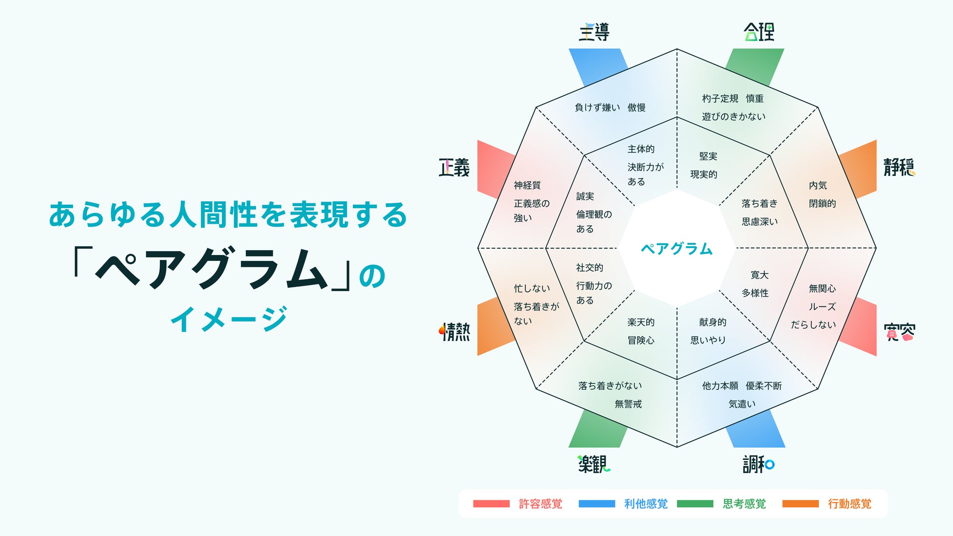 ペアーズでは、これらの4つの感覚をさらに細分化しグラフ化することで、あらゆる人間性を表現する「ペアグラム」を制作しました。ペアーズクエスチョンは、ペアグラムにおいて相手がどんな性質を持っているのかが現れやすい8つの質問を用意しており、お相手の人柄の理解や相性判断をサポートします。