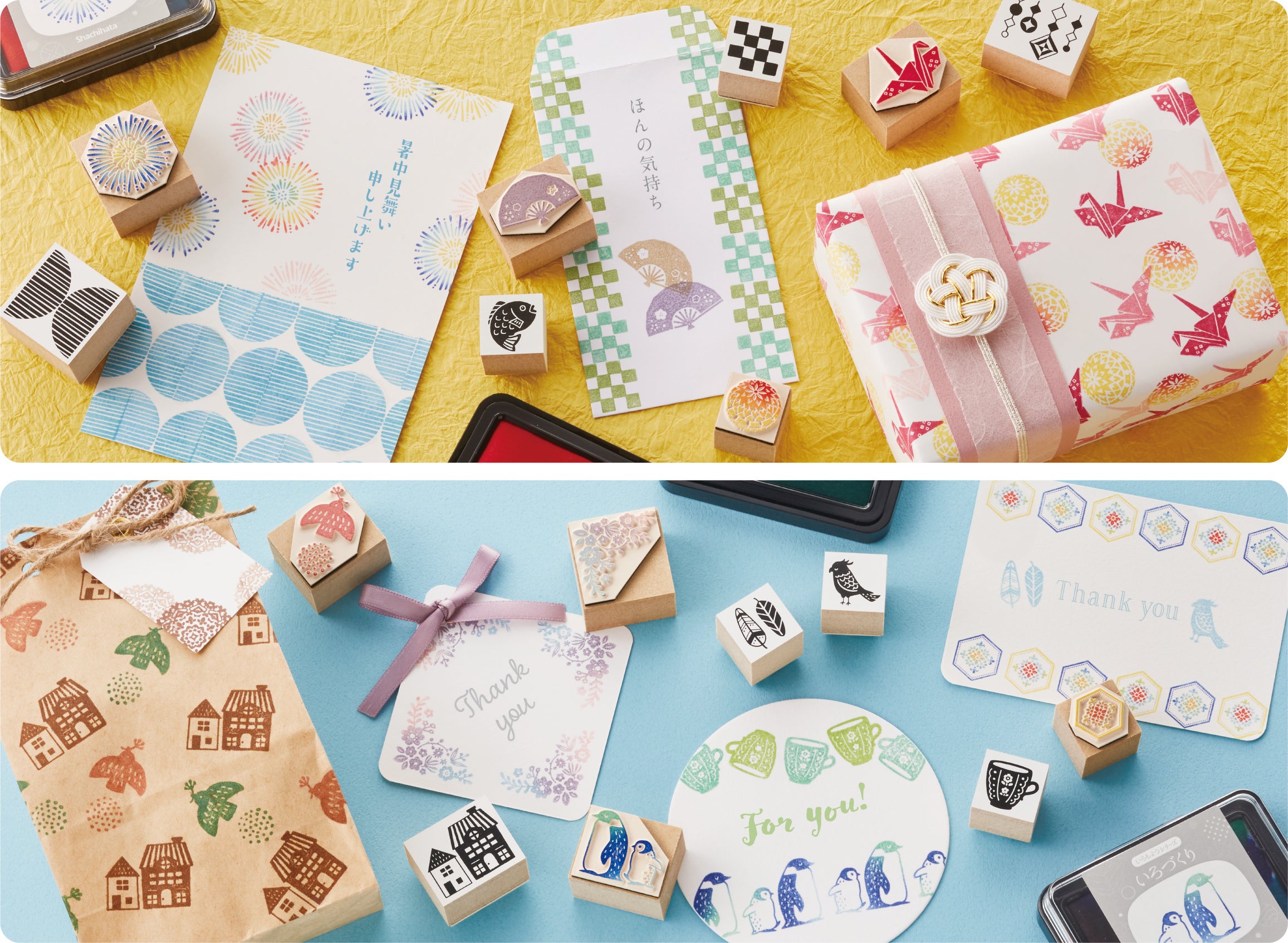 「シヤチハタ クラフトはんこ」は、「いろもようシリーズ」で押すと映えるゴム印シリーズです。第一弾は和柄・洋柄各24種類を発売し、メッセージカードなどのアレンジからラッピングのデコレーションまで幅広く使えるとご好評をいただきました。
