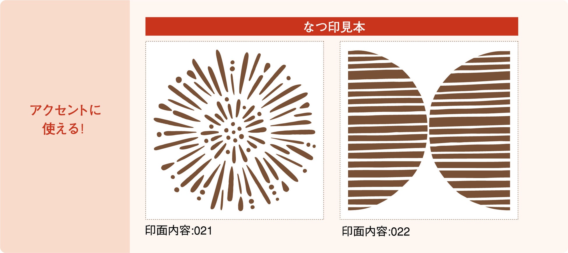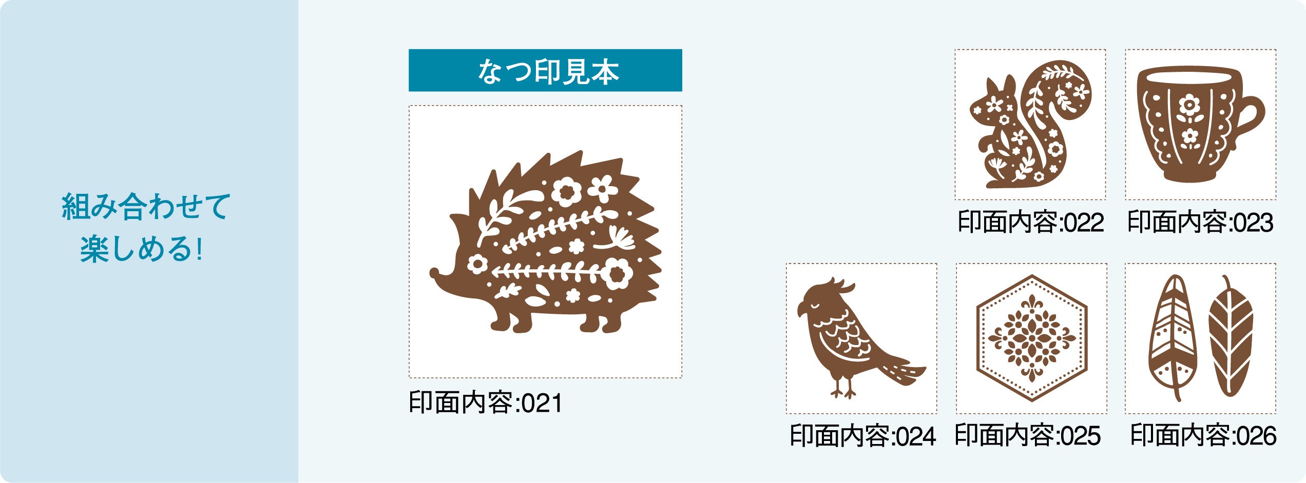印面サイズは全3種類。重ね押しも楽しめる大ぶりな柄から、繊細な模様まで、目的に合わせてさまざまな使い方をお楽しみいただけます。