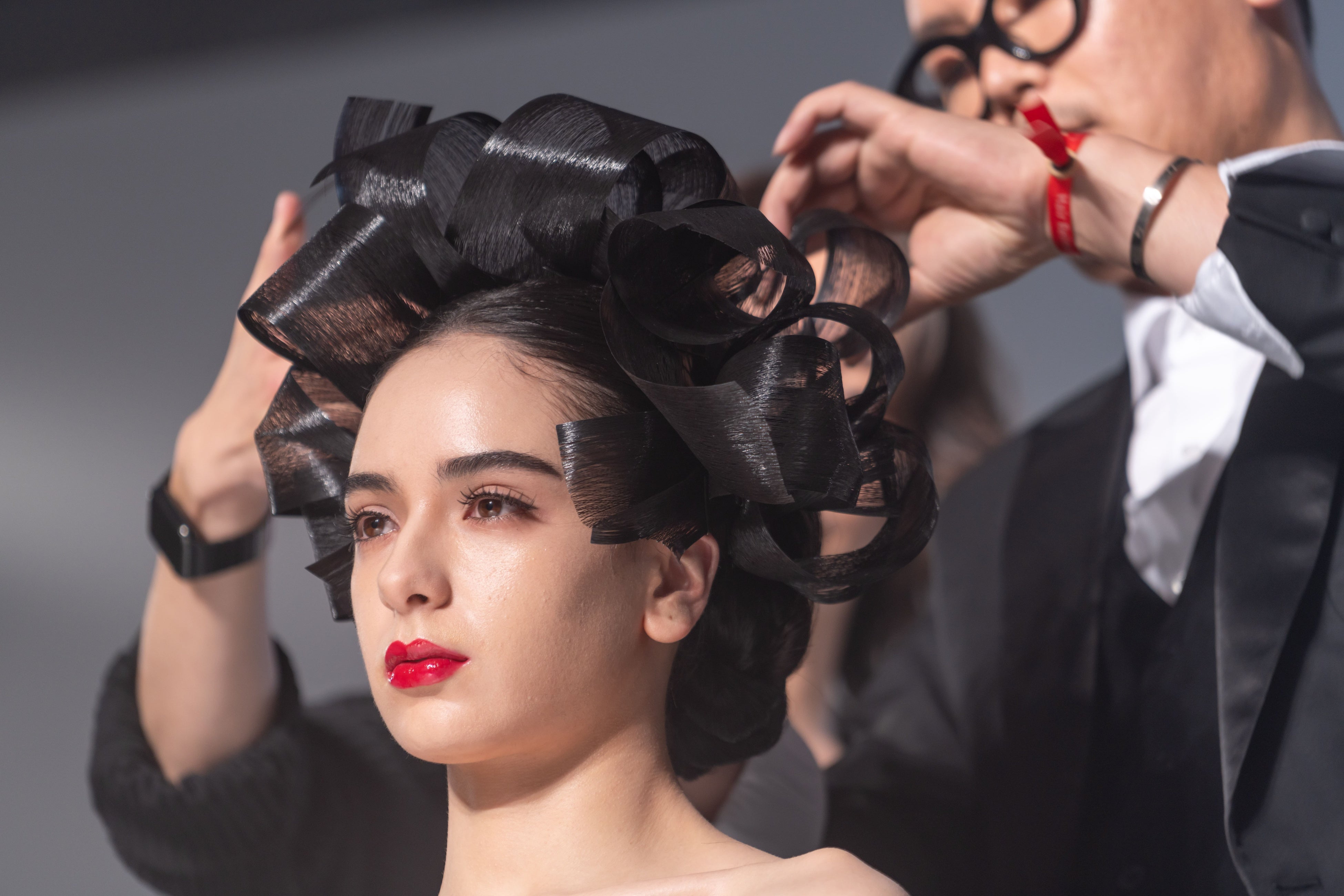 オーストラリアのアーティスト、ネイサン・ヤズベック(Nathan Yazbek)氏によるショーでは、ヘアカラーとステージ上で最後の仕上げカットを披露。
