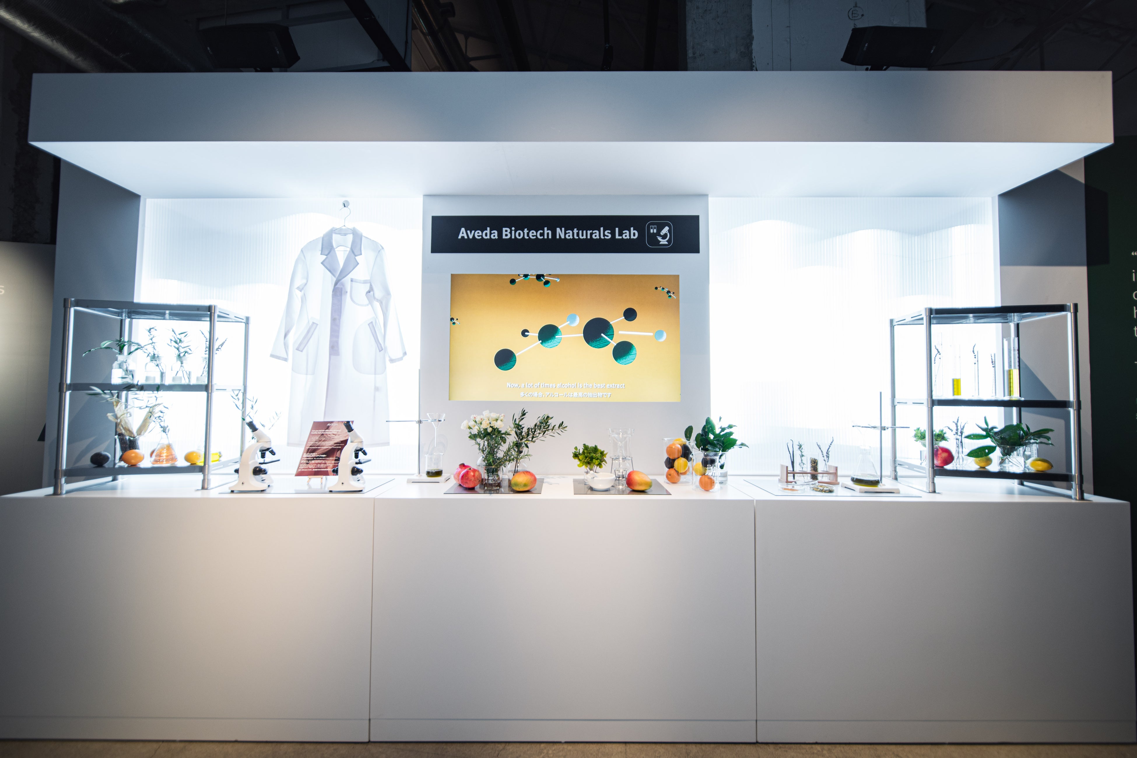 アヴェダの革新的な技術を創造する研究所のイメージ「バイオテック ナチュラルズ ラボ(BIOTECH NATURALS LAB)」に迎えられ、そこで生み出された数々の名品の中から、インヴァティ アドバンス、ボタニカル リペア、ニュートリプレニッシュ、新製品のスカルプ ソリューションといったアヴェダを代表するヒーローフランチャイズが眩いばかりに配され、その素晴らしい効果とともに巡る旅へといざなわれます。