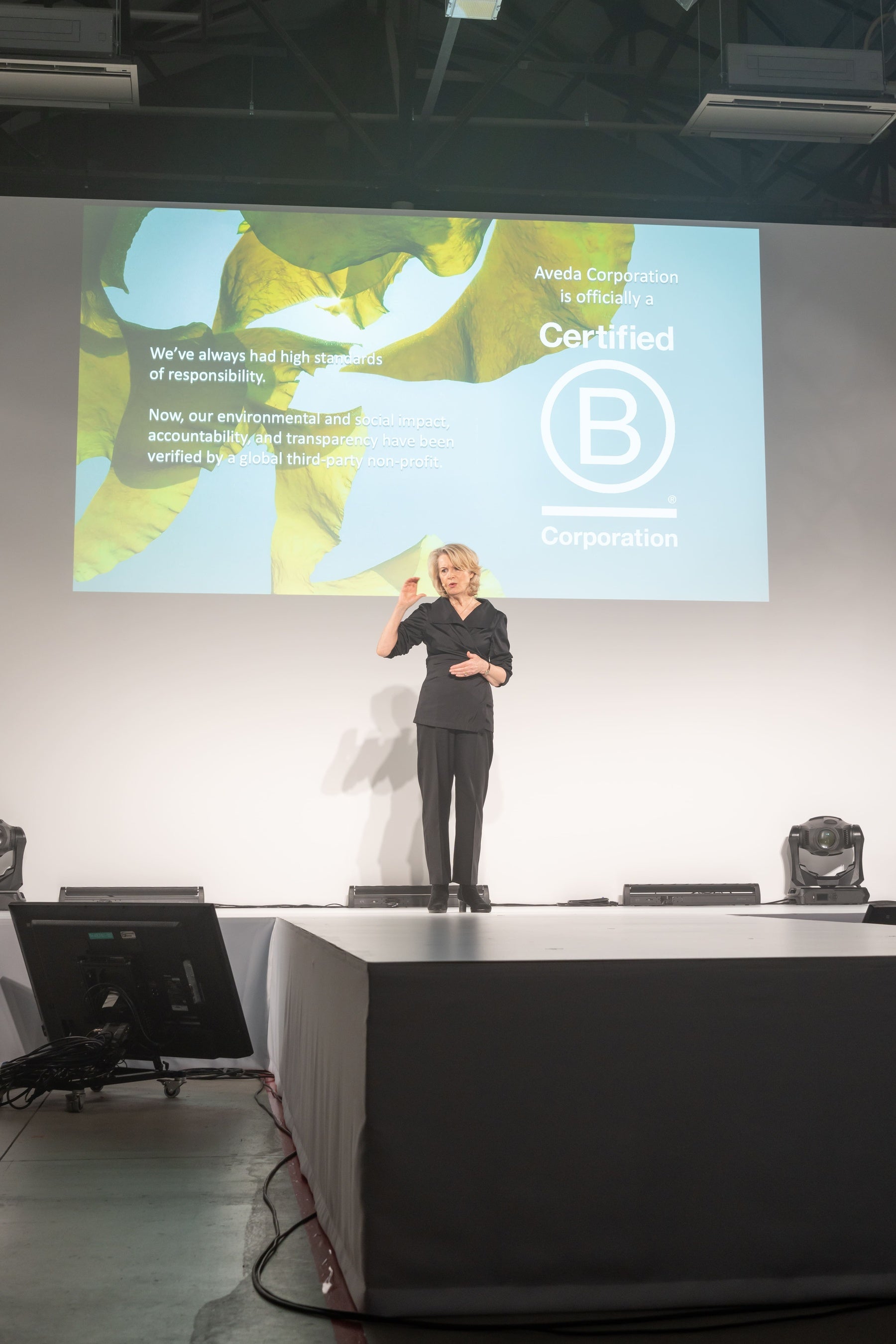 アヴェダのアーティストたちによるヘアショーでは、冒頭にシニアバイスプレジデントのアマンダ(Amanda Le Roux)による日本上陸20周年の感謝と御礼、そして世界的にも非常に取得の難しい認証の一つである「B corp」を取得したことが述べられました。