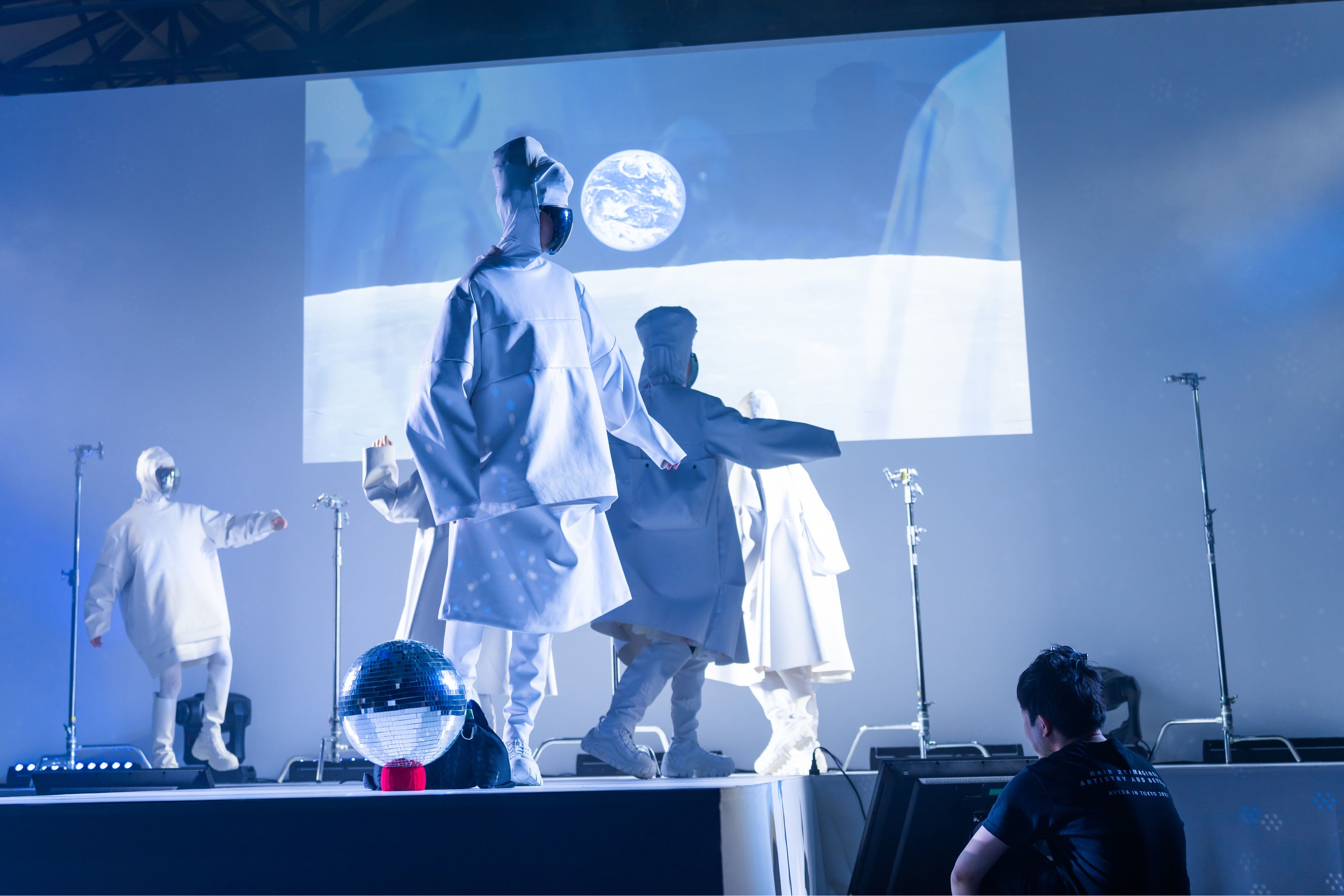 宇宙を漂う白一色の世界から、様々な色を使った新しい形のLOVEを表現。月を背景に白い衣装のモデルのヘアがアレンジされていきました。最後はアーティストとモデルの周りを赤いリボンのようなもので囲み、ステージいっぱいに大きなハートが作られ、人とのつながりへの感謝と愛が述べられました。