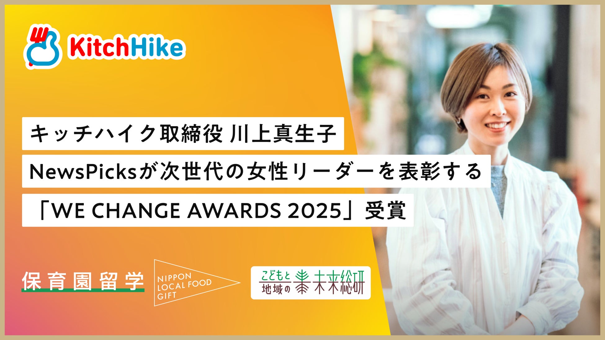 「地域の価値を拡充し、地球の未来へつなぐ。」をミッションに、1-2週間家族で地域に滞在する“こども主役の暮らし体験”「保育園留学」などを展開する株式会社キッチハイク(本社:東京都台東区、代表取締役CEO:山本雅也)の取締役・および「こどもと食文化の地域未来総研」所長である川上真生子が、ソーシャル経済メディア「NewsPicks(ニューズピックス)」が国際女性デーに向けて開催する「WE CHANGE AWARDS 2025」において、個人賞を受賞しました。