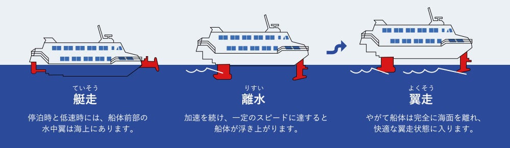 ジェットエンジンで海水を吹き出し空気のかわりに海水から揚力を得て飛ぶ「海のジェット機」 です。水中翼で海面から浮き上がって航行する為、船体への海水の抵抗が少なくなり、時速約80kmの高速航行を可能にし、波の影響も受けずほとんど揺れないので、船酔いの心配も解消しました。
